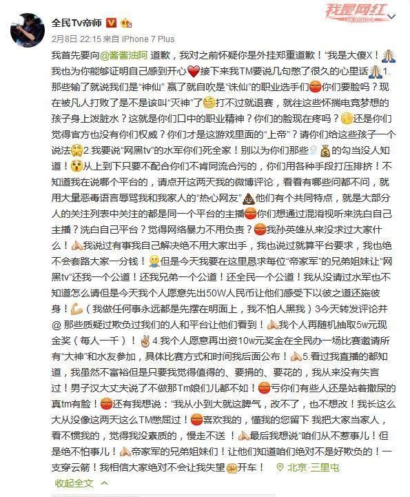 最近,有关于之前《绝地求生》全民吃鸡贺岁杯中“QMTV”战队选手“神仙级”操作一事引发了网友们激烈的讨论。在事发后,有网友质疑为何之前频频“实锤”开挂主播的帝师不敢发声,还有人表示帝师只敢怼其他平台的主播,自家的事情却假装看不见。 就在昨天中午,帝师发出了一条疑似打算“开锤”的微博。 但就在昨晚10点多,全民方面发布了蓝洞的判决结果。从这次蓝洞官方给出的回复来看,QMTV战队参加全民贺岁杯中的选手账号都未检测出使用过外挂。 在这一结果公布后不久,帝师出面向选手道歉,并表示“我也为你能够证明自己感到开心”。但随后帝师话锋一转,说出了一番“憋了很久”的话: 在这条微博中,帝师除了道歉之外还顺便替这些被质疑的选手发声。他认为当时退赛的战队是打不过就选择退赛,往全民的选手身上泼脏水,并且还隔空怒怼了一波“网黑TV”,为全民选手这次的遭遇鸣不平。对于帝师这样的做法,不少网友都表示支持。 但也有网友认为这不过是全民策划的一场炒作,还有人拿出了帝师之前的言论来质疑他的立场。 随着此前星魂、XZ被封100年解封,再到全民选手神仙枪无法检测出外挂,这一幕幕闹剧背后损耗的无疑是蓝洞的公信力。虽然对此蓝洞也表示全民的选手没有使用外挂,但依然有不少玩家不相信他们的判断。不知各位小伙伴认为这次帝师开锤自家选手究竟是真心想打击外挂,还是配合着平台演一出戏呢?欢迎说出你的看法! |