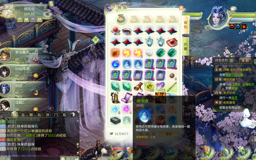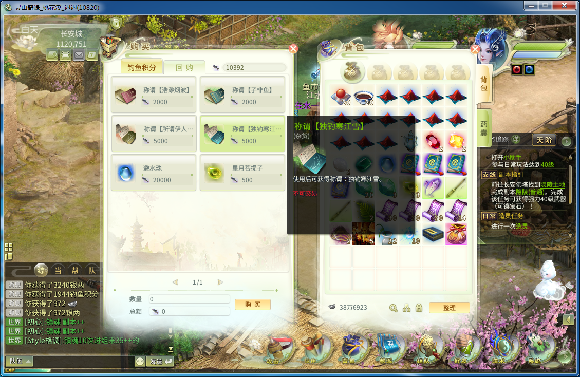 刚进入灵山世界,很多人头上都顶着“所谓一人,在水一方”、“独钓寒江雪”这样的称号,而且还是紫色的,真是让迟迟羡慕得很,还让迟迟很疑惑,还特意往官网和各个游戏平台查找,然而并没发现有什么带称号的礼包。后来思考一番,独钓独钓...这称号可能是钓鱼兑换的?特意去看了下,果不其然,原来紫色唯美称号这样来的! 钓鱼要准备什么?那自然是钓竿!首先你要去杂货店买根钓竿,然后有三个垂钓点,分别是长安钓鱼点、凌烟阁钓鱼点、五行山钓鱼点,个人建议去凌烟阁钓鱼点,因为有四个鱼群,而长安钓鱼点虽然有直接对话积分的老板,但是此地人多,抢位置不容易啊......所以找个人少的地方慢慢钓鱼是多么重要! 钓鱼时会时不时跑来醉汉或者丫鬟,直接点击购买他们的东西即可,在包裹使用,有香囊或者是酒香效果,都是十分钟,在这十分钟内钓到的鱼都是醉鳝鱼,或者香鳝鱼,对话积分高出一倍有没有? 钓鱼点一般有四种鱼群,分别是鲢鱼,草鱼,鲤鱼和鳝鱼,目前只发现四种,或者还有其他鱼种也说不定?个人建议在这里掉鳝鱼,为什么呢?因为迟迟可以用啊......哈哈,当然不是啦,鳝鱼的积分很高,一条普通鳝鱼兑换积分是360,而醉鳝鱼或者香鳝鱼积分是630左右...,总之钓鳝鱼就可以了,保证一天能掉出称号来。 除了称号外,还有避水珠(身边围绕一层好看的水珠)可以兑换,但是需要积分20000,而其他的好看的称号才需要5000左右,只要想获得这些东西,都可以坚持钓鱼,不出一周,不管是称号还是避水珠都拿到的,加油咯! |