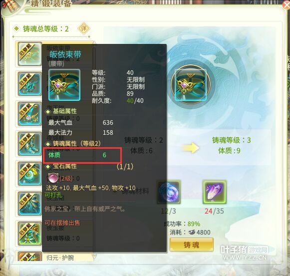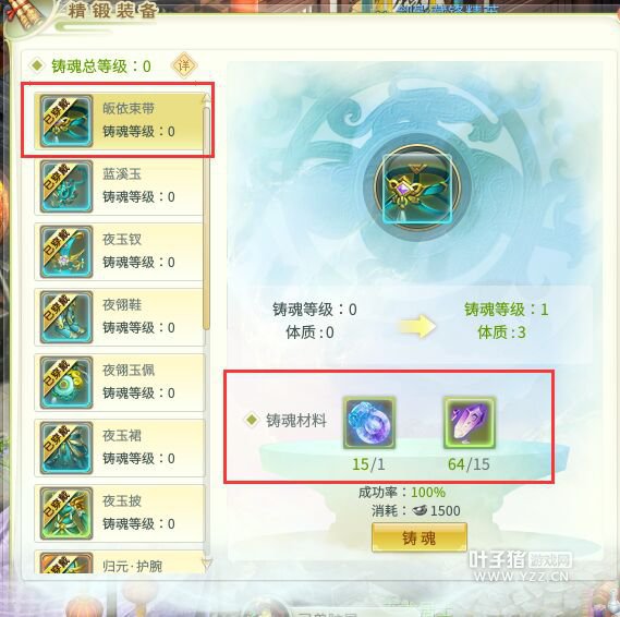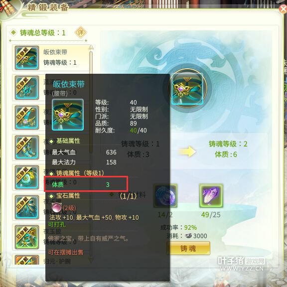 上一期小A给大家浅谈过《灵山奇缘》装备战斗数值提升小诀窍及仓库存放的游戏常识,这次继续讲讲《灵山奇缘》装备培养方法,那就是铸魂。 在游戏角色满48级时会有个支线任务指引装备铸魂,何谓装备铸魂?下面小A带你一探究竟 本期我们重点讲的就是“装备铸魂”,点击“装备铸魂”出现精锻装备界面,装备铸魂需要花费银两。放入要精锻的装备即可查看铸魂等级、装备体质、铸魂所需材料、铸魂成功率。