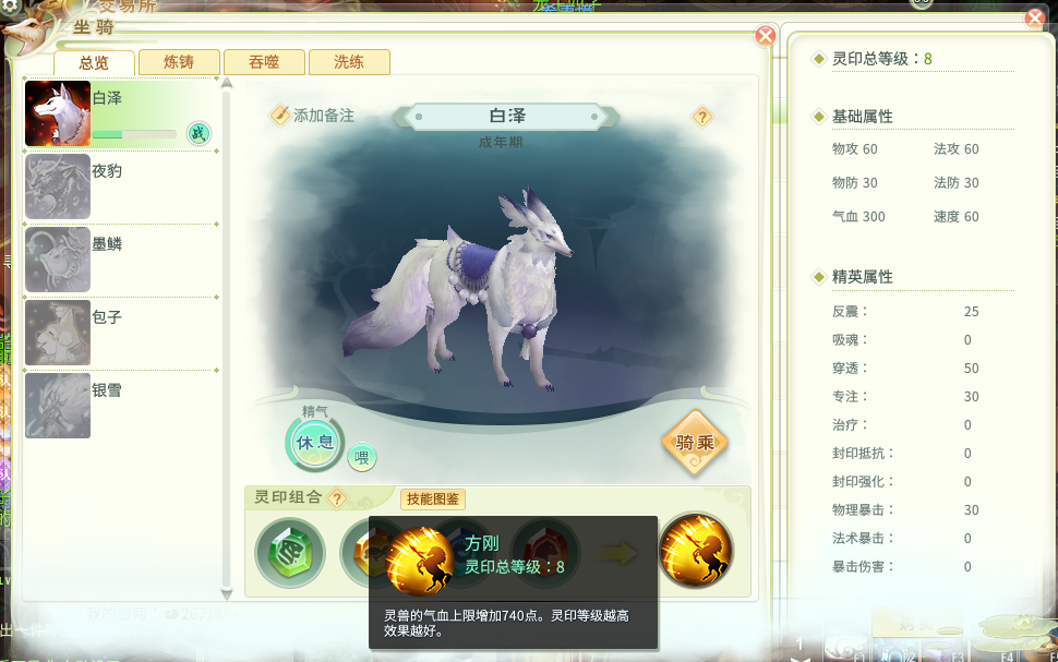 本篇攻略接着上篇补了几个坐骑技能,同时还有坐骑入手后的打造流程,各位灵山玩家觉得有帮助的话可以学习一下! 《灵山奇缘》坐骑灵印与技能选择(上):点击进入 龙鳞:龟+龟+马+马,自身和灵兽减少受到法伤,提高受到物伤害。不推荐,除非SOLO特定职业才有用,否则就是拆东墙补西墙的属性,不如其他技能实惠。 凤羽:豹+豹+马+马,自身和灵兽减少受到物伤,提高受到物法害。不推荐,同龙鳞。 方刚:虎+龟+豹+马,提高灵兽620气血、每级提高30点。推荐!我本人选择的技能,版本更新后提高了属性(原本只有360)。8级740血对输出宝宝是个非常高的血量提升。同时对血宝宝也有不小的影响,万金油的防御属性。 目前版本推荐无畏、怒吼、坚固、方刚、以及灵动迅捷。 制作流程: 1、无脑买聚灵石炼铸、一级灵印过渡使用。偶尔会直接炼铸出二级灵印。 2、四种颜色的灵印三合一吞噬成二级、同时会激活随机的附加属性。吞噬时主灵印颜色不会变、但是纹饰会变。建议事先选好纹饰、用绘文刀绑定纹饰再去吞噬(不绑定的话2级再洗更费钱!)。 3、四个二级灵印到手后、如果有的纹饰不对、只能用再用绘文刀洗练(随机换纹饰、贼贵)。 4、用符玉洗练附加出想要的附加属性、四种颜色的纹饰能激活不同的附加属性,洗到想要的为止,具体附加属性类别如下。 红色灵印(攻击):抗混 专注 吸魂(25-50) 黄色灵印(速度):暴伤 抗混 穿透(25-50) 蓝色灵印(气血):强混 专注 反震(25-50) 绿色灵印(双防):物暴 法暴 治疗(25-50) 附加属性需要什么选什么、比如输出职业黄色和绿色自然选暴击和穿透、但红色和蓝色就没那么重要了。洗差不多就行了,量力而行! 以上是个人推荐,回到开篇的话题,钱!500R的成本大家自行考虑。不过总属性还是不错的,4个2级灵印总属性有60攻、60速、300血、30双防御、灵兽740血、穿透50、暴击50等。 再次原谅我没有认真改错别字,下面配个我自己坐骑的属性图供小伙伴们参考。同时欢迎关注大狗真会玩系列(随缘更新)。 |