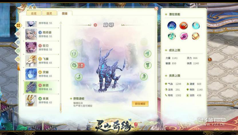 【辟邪】为上古猛兽,两肋生翼,形如狮虎。《灵山奇缘》中,他们身上雕有远古刻痕,体内隐隐透出流光,头部似龙有尖角,十分威严。战斗中,他们属于血攻类灵兽。
