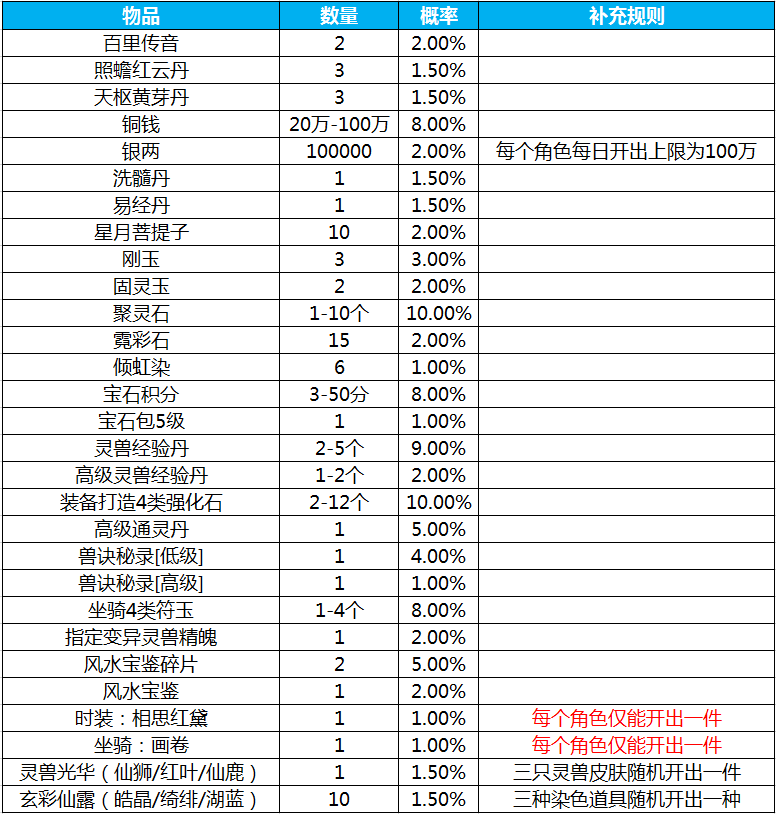 亲爱的玩家: 腾讯首款国风造物回合网游《灵山奇缘》全新暑期版本“夏日众乐”热浪开启,百变灵兽合成,畅爽小队PK,激情帮会战斗,全新服务器“桃花坞”火爆开启,参与就有几率获得极品装备、神兽,带你酣战整个盛夏! 在“夏日众乐”中,玩家只要在商城中购买全新物品“龙纹贝”,即可获得赠品“灵宝葫芦”,现公布全新“灵宝葫芦”奖品概率及明细表。 灵宝葫芦奖品列表及概率: |