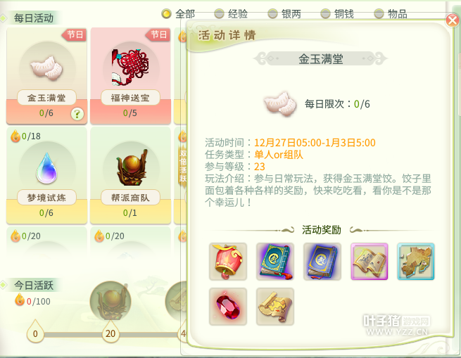 缘起灵山,以爱相生,腾讯首款国风造物回合网游《灵山奇缘》“天降奇缘”公测版本现已开启,点亮三大回合“缘份”,带来奇妙浪漫的三界之旅。在此版本中,灵兽御灵系统正式上线,浪漫情缘及结婚玩法为玩家广牵红线,家园与庭院带你走入雅致田园生活。 元旦佳节将至,三界之中家家户户包饺子庆祝,香气四溢,其乐融融。家家户户在饺子之中暗藏福钱,能够吃到福钱饺子的人,都能够在新的一年中获得好运。三界祥和的气氛吸引福神下凡为三界的人们带来礼物。 本图仅为示意,请以游戏内实际内容为准 更岁交子人情暖 参与时间:12月27日开启——持续至1月3日5点结束。 参与条件:游戏等级需要至少达到23级以上 活动详情: 1.元旦活动期间,玩家可以在日常玩法(镇魂、封妖、梦境试炼、势力任务、无量劫试炼)中获得道具金玉满堂饺。 2.玩家每天最多可获得6个金玉满堂饺; 3.每个金玉满堂饺中都将包裹入奖励与节日积分,为您的佳节添彩; 4. 1月10日之前,右键点击金玉满堂饺都可以领取奖励,1月10日以后,金玉满堂饺道具过期,您可右键使用过期的金玉满堂饺兑换一定铜钱。 本图仅为示意,请以游戏内实际内容为准