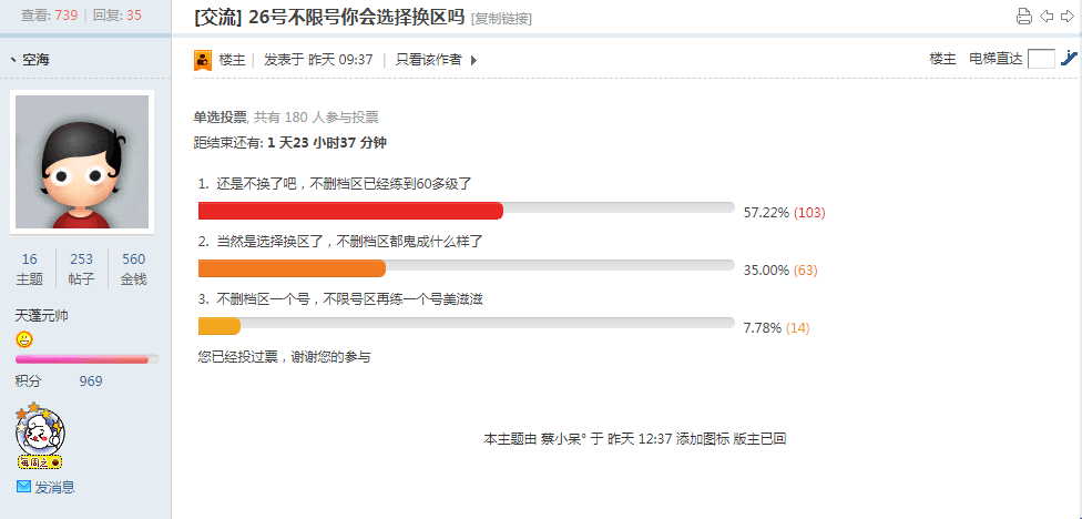 《灵山奇缘》即将在6月26日开启灵雪不限号测试,官方目前先公开了光武、神兽两大新系统。除了游戏新要素,玩家们关心的当然还有游戏会不会开新区。 按照网游的惯例,不少玩家都认为灵山在26日的不限号测试会开启新区。新区向来福利多,不只是新入坑的玩家,老玩家也会冲着这个(当然还有各种各样的原因)换区。 日前,官方论坛有玩家开了个投票帖,内容就是关于这次不限号测试的——如果开新区的话,你会换区吗?这个问题可谓问到玩家的心坎里。而投票的结果实际上又是怎样的? 从图上的结果明显可以看到,玩家倾向于不换区。除了选项中所说的在旧区有个练了很久的号这个原因以外,投了不换的玩家还给出了别的原因。 看了以上的说法,有哪一点是戳到大家的?亦或说大家更想换到新区去?欢迎在底下留言分享你的想法! |