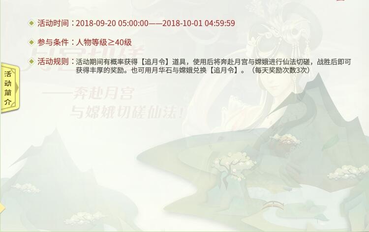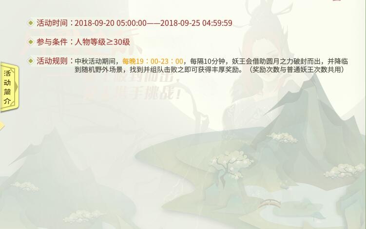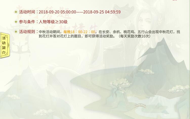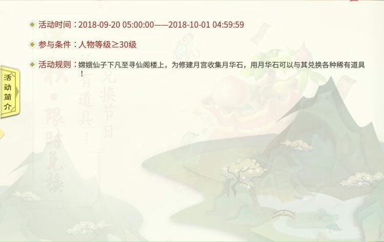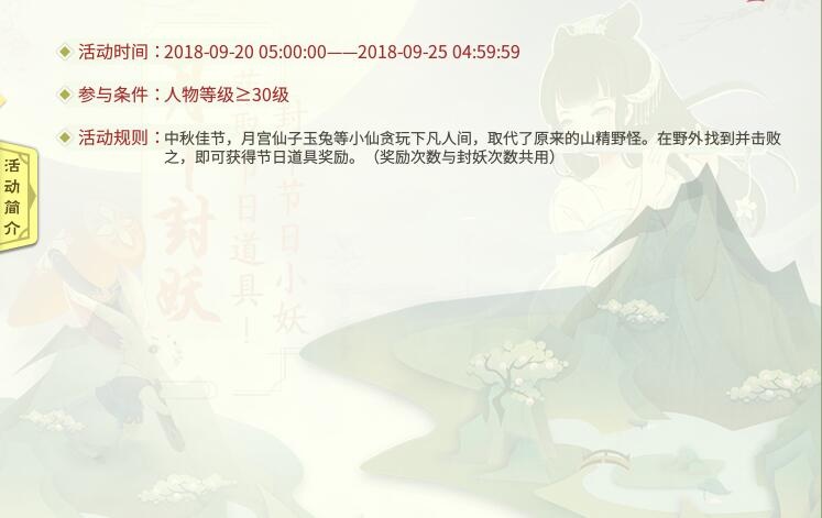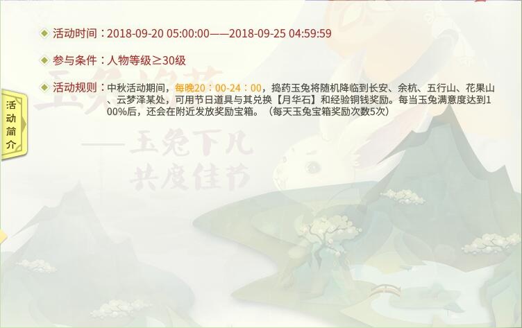 自9月20日更新维护结束后,《灵山奇缘》开始了中秋活动!丰富的活动都有哪些,参与的玩家又能拿到什么奖励?小编现在就为大家整理妥当! 活动流程: 这次中秋活动大致的流程就是参加封妖、答题、打妖王、和嫦娥切磋获得中秋道具(月桂枝、胡萝卜月饼、桂花糕、月饼、胡萝卜),然后找玉兔用中秋道具兑换月华石,再到寻仙阁楼上找嫦娥仙子用月华石兑换各种奖励。 活动具体介绍: 一、月下封妖 二、赏灯答题 三、月圆之际 四、玉兔捣药 五、月宫切磋 六、中秋·限时兑换 |