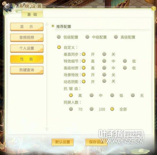 [推荐配置] CPU:Inter? Core i3-4150 CPU @ 3.50GHz 显卡:GeForce GT 730、ATI Radeon R7 240 内存:4G 分辨率:1920*1080 [最低配置] CPU:Inter? Core Duo CPU E7500 @ 2.93GHz 显卡:GeForce 8500 GT、ATI Radeon X1950GT 内存:2G 分辨率:1024*768 Q:如何切换全屏/窗口、设置画质、音频以及快捷键设置等? A:进入游戏后,点击右下角的系统键。 或者按下“ESC”键,选择“系统设置”即可打开基础设置菜单。其中可以设置各种显示方式、画质及性能、音频和快捷键设置。机器配置达到高配的玩家我们推荐您使用高级配置来进行游戏。 了解更多相关信息,请前往http://news.yzz.cn/gamelsqy/ |