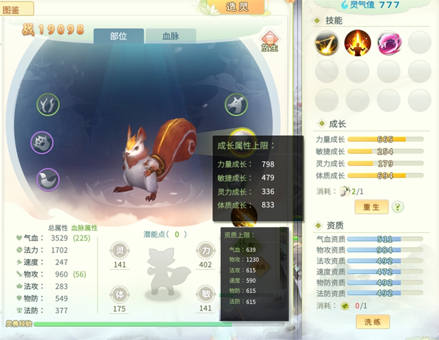如果你只是平民玩家,不想太多浪费资源,那么按照上述步骤合成即可。 如果你是土豪玩家,想打造极品血脉灵兽,那么我建议合成步骤如下: 1,先用多技能灵兽传承,2只不同技能的灵兽传承,可继承其所有技能,即4技能+4技能传承后的技能在0-8波动,先合出6技能以上主宠。(根据自己的财力决定,理论最高12技能,但8技能已属稀有。) 2,副宠洗出对应血脉部件,造灵,激活血脉; 3,副宠洗高属性部位继续造灵,增加灵兽成长,直至满意; 4,洗资质; 5,打技能书。 需要说明的是,一定要根据自己的需求,选择主宠和各个部位,不同类型的灵兽对部位的需求是不同的,不一定级别高就是最好的。 下面附上目前开放的各阶段灵兽资质上限表和各部件成长上限表。
