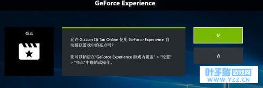 在古剑奇谭网络版游戏中,进入游戏之后GeForceExperience软件就会弹出窗口询问是否自动捕捉游戏中的亮点,我们当然选择是了。
