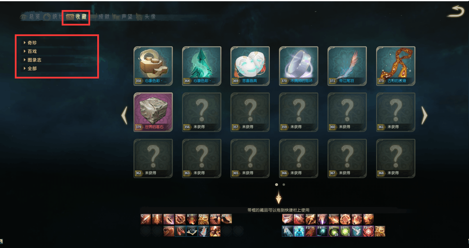 游戏主界面,鼠标移到【十洲博物】图标上,在弹出选项框中点击【藏品】即可打开界面 藏品界面:已获得藏品会直接展示藏品图标,未获得的显示为“?” 藏品的获得途径 各种礼包使用后概率产出 任务产出 怪物掉落 嗅宝罗盘寻宝 藏品的用途 纯收藏 将藏品拖到技能快捷栏中,使用后触发特定效果 将藏品拖到技能快捷栏中,使用后召唤出各种不可思议的东西 将藏品拖到技能快捷栏中,使用后可以各种变身 |