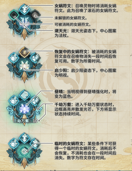 古剑奇谭OL司命是一个可奶可DPS的职业,可能是因为BUG修复导致司命回暖,最近游戏中出现了很多新手司命,但大多新手对司命的技能尤其是核心循环技能都一知半解。本文主要为广大想入司命坑的新人,普及一下司命DPS的技能和常见流派打法。 女娲符文 司命的女娲符文位共有三个常驻符文,特殊条件下会几率触发免费的临时符文位(后面会说到),天光流派下每个召唤兽都要占用一个符文位置,少阳流派下明视是不占用女娲符文的(就是那只兔子)。除了明视,其他的召唤兽都是有存在时间的,当这个召唤兽消失之后,你的女娲符文将会进入冷却(图中倒计时的数字古网目前还没有实装)。 星蕴特技 根据司命星蕴特技选择的不同,司命的技能会有所不同。 天光流派 拥有全职业最好看的面板(但因为司命技能加成很低,虚高的面板造成【最终/秒伤】的转化率相较其他职业低的可怜,所以司命同胞专注打好自己的DPS就好了,不要太去关注转化率,本身转化率这个说法就没有什么科学依据)选择这个流派意味着司命自身为主力输出,辅助以各类召唤兽打伤害。 少阳流派 如果选择了这个流派,你将拥有一个永久的小伙伴明视,主力输出也将变为操纵明视打出的技能,辅助司命自身的技能。 天光流派技能 司命的左右键,盈火咒可以回蓝,两下盈火咒将会使明焰咒无需读条瞬发。 同时盈火咒有几率触发一个五秒钟存在时间的不耗蓝弘光——盈光(下文简称免费弘光) 弘光,司命的辅助输出技能,这个技能是一个双段伤害,第一段打出去会有一个转身动作,在这个转身的动作里可以释放所有召唤灵兽的技能,转身过后会释放第二段伤害。 这就是我们的兔子明视(下文将用兔子代替),兔子本身的攻击非常低可以忽略,它存在的意义在于有一定概率为目标施加崩坠印(几率很高),触发各种印记伤害将会是天光流派的主要输出,崩坠印存在五秒钟,可以叠加多层(不点天赋为3层,点天赋为4层),每次新叠加的层数将会刷新存在时间,这个印记可以由右键触发,也可以由弘光触发,弘光触发的伤害比较高,点了天赋之后单次可以触发两层印记,弘光的每段伤害都会触发印记,所以最优解是宏光或者宏光变招爆掉四层印记。 兔子理论上是可以转火的,但是根据实测它还是会傻傻的一直咬第一个目标,所以遇到需要转火的BOSS,还是要震川召回,然后才会去攻击新的目标(转火的意思是多个boss时需要根据需求攻击不同目标)。 滚石,占用一个女娲符文,存在18秒。滚石的攻击频率吃急速属性,一般情况下攻击次数为33次。 和兔子一样滚石是可以为目标施加崩坠印的,但是这个上印几率非常的看脸,滚石可以转火,根据实测是很好用的,如果司命攻击的当前目标超出滚石攻击范围的时候,滚石会攻击范围内的其他目标。 灵狸,占用一个女娲符文,存在10秒。灵狸的每次攻击都会为目标打上一个狸舞印(非酋福音),召唤灵狸的第一时间会上一个印记,灵狸消失之前会上一个印记,狸舞印存在5秒且不可叠加但会被覆盖,意思是如果前一个印记没有及时触发,将会被新的印记覆盖,上一个印记就被浪费掉了。触发方式与崩坠印相同,触发之后除了印记本身的伤害还会有一个AOE伤害。 灵狸吃急速属性,一般情况下在10秒存在时间内会上4个印记,21急速下开昼晴,灵狸会上5个印记。 当前目标死亡灵狸不会消失,优先攻击司命的当前目标,其次选择仇恨列表第一,无视距离。 金羽,占用一个女娲符文,这是一个PVP技能,会为目标加上一个印记,这个印记第一次被触发时将眩晕目标,40秒内再次触发将会减速目标。 昼晴,简单来说就是召唤兽的士力架,开启技能之后兔子将进入6秒的蓝兔形态,其他灵兽进入三秒的昼晴状态,现阶段滚石收益优于灵狸。 玉虹清绝,着重说一下这个技能,这技能最大的功效是将一个CD中的女娲符文立刻转好,如果女娲符文都在CD中,将会转好CD最长的符文。同时会在司命脚下放置一个小型的回血反隐阵,在残卷加成下司命站在玉虹范围内将会获得专精加成。 司命大招千劫万壑,释放过后会在司命周围造成一个AOE爆炸伤害,同时进入10秒千劫万壑状态,每秒回复自身蓝量,并且右键明焰咒将不需要吟唱。 驱散所有灵兽,配合残卷战斗中驱散灵兽可以获得几秒钟的加速,战斗小马达,追我呀! 这个技能没什么好说的,范围眩晕(一直想吐槽我一个远程职业眩晕范围为什么是周身,每次控制一群小怪都要冲进去),天光流派下这个技能对选中目标可以远距离单体眩晕+司命周身群体眩晕,少阳流派下是兔子周身群体眩晕+司命周身群体眩晕。 打断技能,配合残卷成功打断技能可以刷新所有CD中的符文。 位移技能,向后闪出。 全职业最强减伤,8秒真男人。 解控技能,并且免疫控制6秒。 星蕴特技 第一个在上文中已经介绍过了,是司命的大流派分支,天光与少阳。 第二个选择:明霞 这就是上文提到的可以将崩坠印的叠加上限提升为4层,增加触发概率,每击激活印记层数增加1(就是上楼提过的最大每击触发两层印记),提升印记激活伤害15%(这个伤害之前有BUG是未生效的,修复BUG后感觉司命玩家明显增多)。 在后续更新中加了一个保底机制,15次未触发必定触发一个崩坠印(15次未触发,传说中的非酋就是你吧)。 元阳,消耗38点蓝打出一个范围的AOE并且触发昼晴状态,消耗一个符文充能一层,十层充能即可释放。元阳这层天赋多用于少阳流派 司命的招牌
