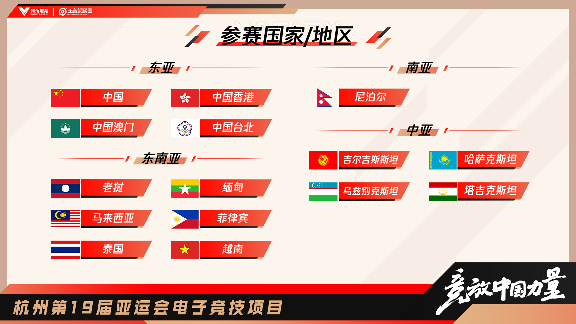 本次王者荣耀亚运版本项目共有来自 15 个国家和地区的队伍前往杭州参与本次盛会,包括:中国、中国香港、中国澳门、中国台北、老挝、缅甸、马来西亚、菲律宾、泰国、越南、尼泊尔、吉尔吉斯斯坦、哈萨克斯坦、乌兹别克斯坦、塔吉克斯坦。马来西亚获得银牌、泰国获得铜牌。
