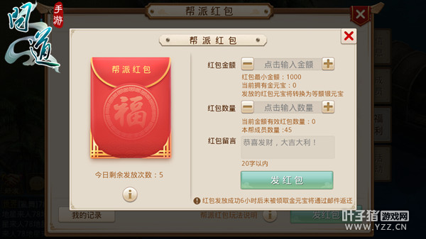 在《问道》手游10月份的更新中,帮派福利又增加了一个新功能——给帮派成员发红包。通过这个新功能,道友们可以将自己的金元宝通过发红包的形式送给自己帮派的其他成员,帮派成员拆开红包获得的金元宝将转换成等额的银元宝。对这个功能还不熟悉的道友们,就让小编给你们介绍一下吧。 【大家一起抢红包】 本次更新后,在帮会的福利功能里新增了一个“帮派红包”功能,通过这个功能,道友们可以给帮会成员发放红包。帮派达到高级、且帮派人数不少于20人即可开启此项功能,道友们可以通过红包将自己的金元宝发给帮会成员,是一个增进帮会团结度的好办法哟。 道友们收到的红包会在“帮派红包”界面显示,点击对应红包即可获得红包中的银元宝奖励,同时还会收到发放红包的道友的祝福哦。道友们获得的红包奖励将直接计入自身的银元宝总额中。 【红包发放规则】 红包功能功能开启条件: a. 帮派等级到达高级、帮派人数不少于20; b. 50级以上的道友可通过帮派福利界面进入帮派红包功能进行红包的发放与领取; c. 红包发放花费金元宝,金额上限与帮派人数相关,下限为1000金元宝,发放的红包元宝将转换为等额银元宝; d. 每份红包每人只可领取1次,领取成功将随机获得红包内一定额度元宝; e. 红包发放成功6小时后未被领取的金元宝将通过邮件返还。 了解更多相关信息,请前往http://wd.yzz.cn/sy/ |