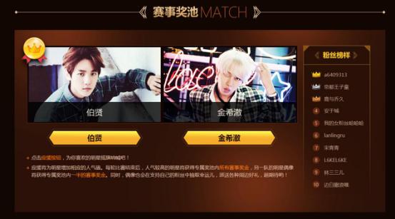 11月11日晚8点,韩国偶像明星金希澈和伯贤将再次回归斗鱼直播,粉丝们可通过斗鱼直播专题页中的众多游戏环节,与偶像亲密互动。 在主频道和希澈、伯贤各自的直播窗口下方都设有粉丝霸屏和接龙功能,粉丝们在观看偶像直播的同时可为各自喜欢的偶像加油助威。其中粉丝选择霸屏功能后,将在直播屏幕的左下方出现持续10秒的金希澈或伯贤卡通形象动态图,每霸屏一次将消耗一千鱼翅。 (图为霸屏后出现的伯贤卡通形象图) (图为霸屏后出现的金希澈卡通形象图) 在接龙游戏中,粉丝们可每5人完成一次接龙,每接龙一次将消耗100鱼翅,接龙成功后,将在屏幕左下方出现EXO或者SuperJunior团体卡通形象动态全家福。此外,每次接龙中将有30秒的间隔等待时间,若30秒内无人参与接龙游戏,那本次接龙将会失败。 接龙游戏开始后,在直播屏幕左下方将出现接龙提醒图标,粉丝们只需点击“继续接龙”即可参与到游戏中。 (图为接龙成功后,直播屏幕左下方出现的EXO团体卡通形象全家福) (图为接龙成功后,直播屏幕左下方出现的SuperJunior团体卡通形象全家福) 在斗鱼专题页直播屏幕下方,还设有“抢VIP卡座”环节,粉丝们在观看直播的同时,可以向自己的偶像强势应援,获得VIP卡座,从而让偶像记住你。在此前的直播中,无数粉丝在VIP卡座,在希澈和伯贤直播的最后,他们都用可爱的中文,念着VIP卡座粉丝的名字,向他们逐一表示感谢,被偶像当着你的面,指名道姓般的感谢是件多么幸福的事。值得一提的是,首次“抢VIP卡座”将消耗100鱼翅,此后再抢VIP卡座,将增加100鱼翅,以此类推。 此外,本次《SM超级明星联赛》本选赛中还设有了“应援奖池”环节,获得应援礼物最多的明星将获得自己联赛奖池内的所有奖金,输掉比赛的明星只能拿走自己奖池内一半的奖金,而参与应援的粉丝将有机会获得明星亲自准备的亲笔签名周边礼品。 另外,每场本选赛都将有神秘嘉宾前来应援,粉丝们将通过投票的方式决定嘉宾的互动内容,SM公司旗下众多耳熟能详的偶像明星,你最想与他怎样互动呢? 双十一晚上8点,来斗鱼看明星的直播,首次与偶像视频聊天版的亲密互动的机会不容错过哦! |