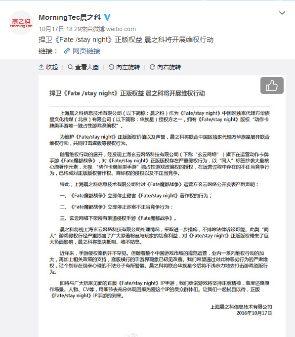 近日,晨之科针对玄云网络旗下产品《Fate魔都战争》,公开声明对旗下《Fate/stay night》IP进行维权行动并公开声明。声明中提到《Fate魔都战争》产品中大量充斥《Fate/stay night》原著内容,并以“同人”标签抄袭大量核心原著作元素,无视 “动作卡牌类型手游”独占性游戏改编权的授权,在运营过程中存在的不正当竞争行为,已构成对正版版权著作权、商标权的侵权以及不正当竞争。 十月中旬晨之科于官方微博发出抵制侵权声明 “同人”一词来自日语的“どうじん”,原指有着相同志向的人们、同好。一般为动漫文化的用词,指“自创、不受商业影响的自我创作”,或“自主”的创作。它比商业创作有较大的创作自由度,以及“想创作什么,便创作什么”的味道。需要注意的一点是,普遍上认定同人作品是不具有版权的,也就是同人作品不可以进行商业运作,而且随时可以被版权所有者取缔。 因此,类似于《Fate魔都战争》打着“同人”的旗号在市场上推出的游戏无疑是对《Fate/stay night》IP版权方的不尊重,更是对IP拥有者晨之科的利益造成严重的损害。所有的同人作品都应该建立于热爱与充分理解正版IP故事情节的基础上进行二次创作,然而《Fate魔都战争》则是借着“同人”的名号以此牟利。 对于热爱《Fate/stay night》的众多玩家而言,游戏侵权这种行为最大的危害就是:玩家们对这个游戏付出的爱与精力根本就不会反馈到喜爱的角色上。毕竟我们都生活在三次元当中,二次元文化的生存空间就是如此残酷。喜欢的漫画不买单行本就会腰斩,喜欢的番剧不入碟不会有第二季。游戏也一样,喜欢的游戏不支持正版也就永远不会有更好的作品了。 同人作品更多地是对原著IP爱的衍生,因此同人作品不是侵权借口,更不是游戏厂商以此来牟利的挡箭牌。晨之科及旗下咕噜游戏希望通过对此类侵权行为的严肃维权,让个别存在侥幸心理的不法分子有所警醒。尊重情怀,注重品质,这是一个IP游戏最关键的成功要素,对于盗版游戏,从今以后晨之科将坚决抵制、绝不姑息。 |
