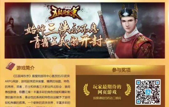 中国游戏产业最为权威的评选活动——第十一届年度优秀游戏评选大赛(金翎奖)将在厦门举行。作为“汇聚玩家所爱”的业界盛事,被誉为游戏界“奥斯卡”的金翎奖以其评选的权威性和公正性而受到游戏行业的广泛认同。 近日,搜狗游戏正式确认,将携首款独代页游《五鼠闹东京》角逐2016金翎奖“玩家最期待的网页游戏”奖项。 《五鼠闹东京》是一款以“三侠五义”为故事背景的2D武侠ARPG网游,作为搜狗游戏首款独代,该款游戏集搜狗之力投资千万资源,历时19个月精心打磨而成。游戏延续武侠背景,以精致唯美的画风、革新性的游戏系统、独具匠心的创新玩法,带玩家穿越回宋朝,体验“三侠五义”的纯正武侠世界。而丰富多彩的角色技能和精彩刺激的副本体系,更是赋予了游戏多样性的玩法和轻松有趣的氛围,在前两轮的删档和不删档的封测当中,《五鼠闹东京》已经获得了游戏市场和众多玩家的好评和认可,各项关键性数值表现均十分优秀。11月18日,游戏将正式在国内全平台上同时首发,让更多玩家能够体验这个崭新的武侠游戏世界。 搜狗游戏是国内领先的游戏平台和渠道商,在页游和手游端口聚集了数亿优质的用户流量,其中搜狗页游是是搜狗基于PC端网页游戏产品向用户提供娱乐服务的平台,聚合了搜狗输入法、搜狗导航、搜狗浏览器、视频端等高人气分发资源。页游平台通过与国内各家顶级研发商高效合作,目前拥有产品过百,行业排名领先。承载各类产品,从角色扮演、回合制、策略、休闲到街机射击等全类型产品的运营与推广,更有影视剧、小说IP强力助阵。搜狗页游将倾情为用户提供全方位的PC端网页娱乐体验。 此次,搜狗游戏首款独代页游《五鼠闹东京》以黑马的姿态获得金翎奖的提名,展现出搜狗游戏在游戏产品方面的强劲实力,已获得行业和玩家们的一致认可和好评。 创办于2005年的金翎奖是国内众多游戏评选中最具含金量的评选活动,并在过去十年中深度调研产品信息,尊重玩家意愿,公平公正评选,遴选出了大量深受玩家喜爱的优秀游戏,成为国内玩家了解游戏产品梯次排名、厂商表达产品理念的风向标。 为充分体现广大游戏玩家的心声,2016金翎奖仍由全国玩家通过网络投票的方式评选出最终的获奖作品和优秀媒体,我们期待玩家们为自己喜爱的优秀产品和媒体投上一票。本次投票由10月12日开始,至11月16日结束——相信在本届金翎奖的角逐中,搜狗游戏首款独代页游《五鼠闹东京》将不会辜负大家的期待! 欲了解更多奖项信息,请移步至http://wan.sogou.com/630/?source=0012000300000下载,或关注搜狗游戏官方微博(微博ID:搜狗游戏中心 微博地址:http://weibo.com/sogougame?refer_flag=1001030101_)(微信公共账号:搜狗游戏) 欲了解更多详情,请访问金翎奖官方网站,也可微信搜索公众订阅号“ChinaJoy”或扫描二维码关注ChinaJoy官方微信公众号,获取金翎奖相关信息。 金翎奖官方网站 http://jlj.chinajoy.net |