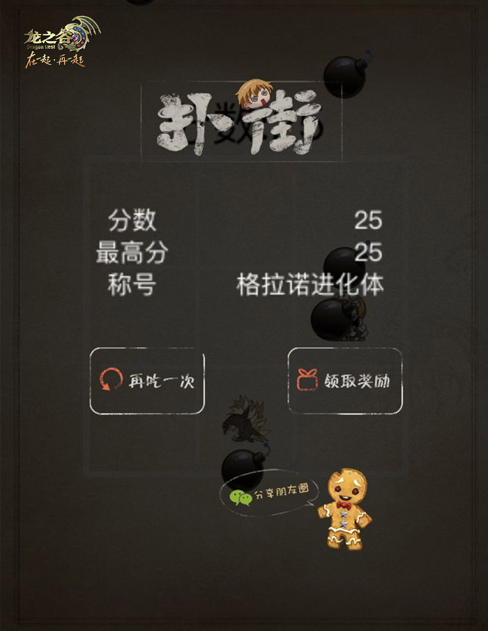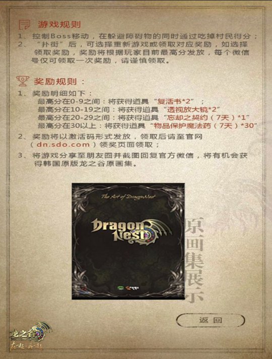 《龙之谷》格拉诺巢穴的上线给各位谷迷们带来了全新的挑战。经历了惊险刺激的战斗之后,是时候来放松一下了!格拉诺の逆袭微信小游戏,一样的格拉诺,不一样的吃货玩法!通过简单的躲避赢得分数,帮助变Q了的格拉诺吃掉一个个村民。还可以用分数换取不同的道具奖励哦,并且有机会拿到韩国原版《龙之谷》原画集!格拉诺一上线就给大家带来这么多福利,可千万别让他饿肚子啦! 上手容易精通难,吃货的大灾难! 格拉诺の逆袭这款小游戏,玩法十分简单。通过在九宫格中移动Q版格拉诺,在躲避从四面八方飞来的炸弹同时,吃掉九宫格内的村民们。类似贪吃蛇吃豆一样的玩法,却可以见到《龙之谷》中你所熟悉的游戏人物。而且这款小游戏,完美诠释了什么叫做上手容易精通难,玩法简单易懂,想拿高分却需要实力和运气的完美结合。在0~10分段,Q版格拉诺的食物是---大哭的萌骑士;10~20分阶段,是---瑟瑟发抖的兽娘;而20~30分阶段,惊恐的学者将成为你饱腹的美食。至于分数再高食物会变成什么,就需要高手玩家们自己去探索啦! 吃货逆袭有诀窍,手脑全力协调战! 看似简单的玩法,想拿高分就要从各个细节方面进行提升啦!首先这是一个用手指在九宫格内进行移动的游戏。玩家们能活动的范围并不大,并且在利用手指进行移动的过程中,会被自己的手部遮挡一定视野。在这个需要玩家进行闪避的游戏过程中,视野就是成功的关键。因此要灵活观察四面八方的情况,谨防在视野被挡住的范围内出现一颗炸弹导致游戏失败。另外,炸弹是以直线的轨迹向前发射的,因此玩家们在躲避时,最好避免被炸弹尾随的情况发生,从而更好的随机应变,改变自己的运行轨迹。 实用道具奖励多,原画集来助阵! 不管再厉害的玩家,也会有失误扑街的时候。当感到目前的成绩达到了自己极限时,玩家们就可以点击扑街画面中的领取奖励来换取《龙之谷》端游道具了。0-9分道具为复活书,10-19分可以获得透视放大镜,20-29分是忘却之契约,30分以上的玩家可以获得物品保护魔法药。注意兑换到的奖品是根据最高分数决定的,而且奖励只能领取一次,根据自己的需求进行礼物的领取吧!最后如果将游戏分享到微信朋友圈,还有机会获得韩国原版《龙之谷》原画集哦! 与吃货的终极战斗,视频征集活动! 除了格拉诺の逆袭小游戏之外,玩家们在《龙之谷》里,还能一睹他的真身。不再Q版的格拉诺凶狠至极,不知道有多少谷迷倒在他的大刀之下。为此,所有能够成功通关的谷迷们都应该得到相应的奖励才对!《龙之谷》燃战最动作新巢穴视频征集大赛,邀请谷迷们录制自己通关格拉诺巢穴的全过程,投稿后有机会赢取高达20w的点券、三星曲面显示器、韩国原版《龙之谷》原画集等大奖!适当加上配音或字幕等,还能为自己的投稿加分,这样的好机会可以一定要抓牢! 前往活动页面:http://act2.dn.sdo.com/Project/gelanuomovie/ 手脑全力协调战,《龙之谷》小游戏格拉诺の逆袭挑战吃货极限!更有韩国原版《龙之谷》原画集等你拿!你还在等什么? 《龙之谷》全新版本燃战·危机热血来袭! 格拉诺巢穴绝境激斗!大战模式角逐战场王者! 童话套装游梦幻王国!阿依夏时装演旷世绝恋! 沙龙变身套颠覆世界!同名漫画引爆终极对决! 最新客户端飞速下载: http://dn.sdo.com/web10/down/game.asp 玩家互动娱乐,请扫描下载掌上龙之谷 插入掌上龙之谷二维码图片 更多龙之谷信息,请关注龙之谷官方微信服务号 插入微信服务号二维码图片 龙之谷官方段子手,请关注龙之谷官方微信订阅号 插入微信订阅号二维码图片 参与互动及讨论,请关注龙之谷官方微博: http://weibo.com/doublekill 插入微博二维码图片 了解玩家同人文化,请关注龙之谷官方同人小站微博与微信: 微博:http://weibo.com/u/5995646551 插入同人小站微博二维码图片 插入同人小站微信二维码图片 了解更多相关信息,请前往http://dn.yzz.cn/ |