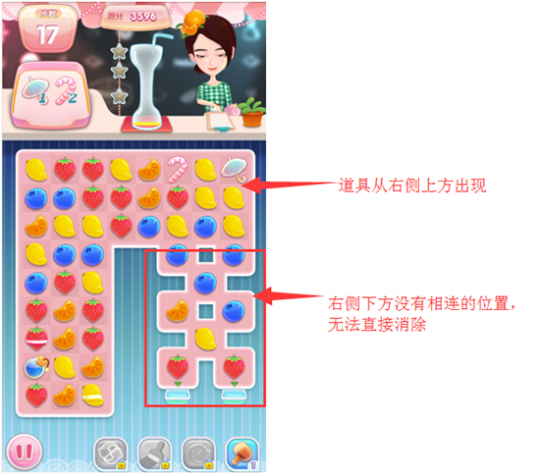 最近很多兔子们(游戏玩家)反馈第73关太难了!!! 作为轻松的休闲的游戏,怎么能难倒大家呢!这里特意把通关攻略奉上,希望对各位兔子有所帮助~ 首先,要清楚当前的目标,是需要收集1个伞和2个J型糖; 然后对当前关卡图进行分析: 需要收集的道具是从右侧上方掉了,因此需要消除的位置是右侧位置; 右侧下方没有直接连接的位置,可以依靠在左侧平行位置消除横线炸弹或者在右侧上方位置消除竖线炸弹的方式来消除右侧下方水果; 因此在游戏过程中主要收集条形炸弹和彩虹,方形炸弹和叉形炸弹的效果不会很好; 在游戏过程中可以将彩虹和条形炸弹凑在一起使用,还可能达成“一次收集3个装饰物”的成就哦~ 内部消息:戚薇亲玩账号已达到最后几关!在这里恭祝各位兔子闯关成功,早日与女神相聚哦!游戏官网:http://xgx.wulifun.com/front/ 了解更多相关信息,请前往http://sy.yzz.cn/ku/xgxxl/ |