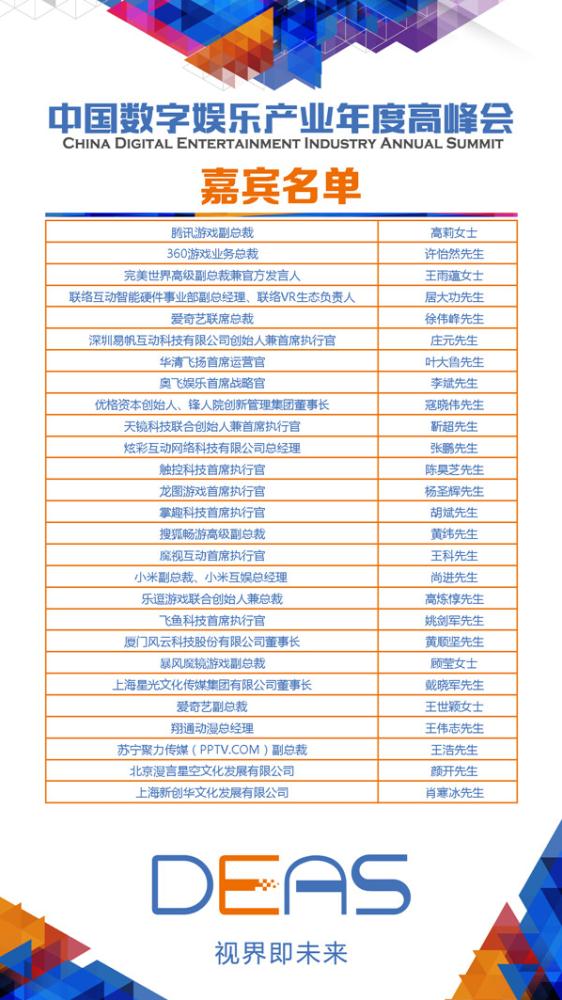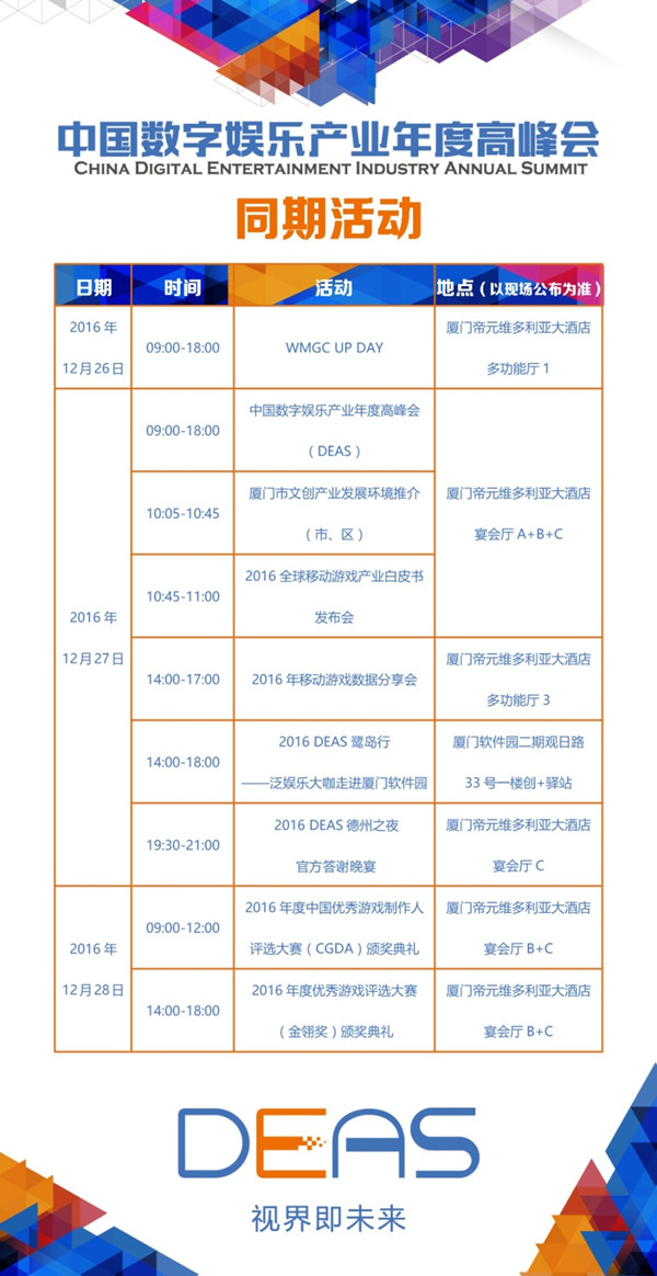 时值双十二,在这大喜的日子里,看着别人在疯狂刷刷刷,你是否还在…… 还在为抢不到红包而烦恼? 还在为装满购物车而头痛? 还在为透支信用卡而抓狂? 如果你还在考虑买买买,那就OUT啦!不因虚度年华而悔恨,不因碌碌无为而羞耻,比起物质需求,精神食粮更重要——2016中国数字娱乐产业年度高峰会(DEAS),荟萃数字娱乐产业一线大咖,只要届时去参会,带你开眼带你飞! 在厦门市人民政府的指导下,由移动游戏企业家联盟(MGEA)、厦门市思明区人民政府主办,上海汉威信恒展览有限公司、中国VR/AR娱乐产业联盟(VREIA)联合主办,厦门市文化改革发展工作领导小组办公室、厦门市经济和信息化局大力支持的2016中国数字娱乐产业年度高峰会(DEAS)将于2016年12月27日至28日在厦门帝元维多利亚大酒店举办。 本届年会以“视界即未来”为主题,分设四大主题板块,分别是上午的“鹭岛话春”和下午的“游戏:游亦有道”、“VR/AR:方兴未艾”、“泛娱乐:一生万千”,就游戏、VR/AR、泛娱乐等热点产业领域话题邀请产业领袖和企业高管出席并做主题演讲,发表独立观点并展望2017年度产业热点。与此同时,年会同期还将举办多个相关活动,为数字娱乐产业助力发声。 值此盛事,本届中国数字娱乐产业年度高峰会(DEAS)将倾情回顾2016数字娱乐产业发展态势,精心盘点2016数字娱乐产业热点,深入解读2016数字娱乐产业现象,权威预测2017游戏以及VR/AR、泛娱乐全新动向。在这里,不仅能聆听到引领全产业的成功经验分享,更能获得左右整个泛娱乐产业未来发展方向的真知灼见。未来属于那些做好准备的有识之士,而DEAS无疑具有总结全年产业发展历程、展望来年产业发展规划的重大意义。 2016 DEAS年会抢票地址 http://www.huodongxing.com/event/9358762086200 2016 DEAS年会报名二维码 (限时免费,限额2000人) 高朋满座,共谱产业华章 作为以IP为核心的泛娱乐应用生态大会,DEAS将以立足中国,放眼全球为目标,为国内外数字娱乐知名企业与业界精英搭建深度交流合作平台,旨在打造最具国际性、专业性和权威性的数字娱乐行业盛会。在过去数年中,诸多极具时代精神和智慧的企业家们都曾在DEAS的前身,也就是历届移动游戏产业年度高峰会(MGAS)上发表过精彩演讲;而今年恰逢年会更新升级的东风,众多重量级业界大咖现已确定将在年底莅临鹭岛参会,就游戏、VR/AR、影视、动漫、文学等热点产业领域话题邀请产业领袖和企业高管出席并做主题演讲,共同回顾过去一年大事记,展望2017年度产业热点,共谱中国游戏产业的崭新华章。 以下是目前已确认出席的DEAS演讲人名单(排名不分先后,最终名单以实际到场人员为准): 2016 DEAS年会抢票地址 http://www.huodongxing.com/event/9358762086200 2016 DEAS年会报名二维码 (限时免费,限额2000人) 风起云涌,汇聚玩家所爱 与此同时,作为DEAS同期活动之一的2016年度优秀游戏评选大赛(金翎奖)日前也已公布了获奖名单。创办于2005年的金翎奖至今已举办至第十一届,无疑是国内众多游戏评选中最具含金量的评选活动,被誉为中国游戏业的“奥斯卡”,并早已成为国内玩家了解游戏产品、厂商表达产品理念的风向标,“玩家最喜爱”及“玩家最期待”奖项更被视作众多游戏厂商宣传旗舰产品和精品新作时趋之若鹜的醒目头衔。届时,众多知名游戏厂商、制作团队及媒体都将派出高管前来领奖,本届金翎奖颁奖典礼现场由此将云集众多重量级的企业家与业界精英,共同打造属于中国数字娱乐产业的王者荣耀! 以下是目前已确定的第十一届金翎奖接奖嘉宾名单(排名不分先后,最终名单以实际到场人员为准): 2016 DEAS年会抢票地址 http://www.huodongxing.com/event/9358762086200 2016 DEAS年会报名二维码 (限时免费,限额2000人) 互利共赢,一路相伴同行 尤为值得一提的是,自本届DEAS招商活动全面启动以来,众多厂商积极前来咨询并踊跃报名,为本届年会添砖加瓦,让这场举世瞩目的泛娱乐盛会更加熠熠生辉。目前,在广大业内同仁的倾情支持与大力协助下,本届DEAS的筹备工作正顺利进行中。在此,DEAS主办方特意对本次大会的各家赞助商表示鸣谢,希望大家携手并肩,共同努力,为促进数字娱乐产业乃至泛娱乐领域相互沟通交流、相互合作、互利共赢而贡献自己的力量。 感谢以下赞助商为2016中国数字娱乐产业年度高峰会(DEAS)倾情助力支持: 立足中国,放眼全球,移动游戏企业家联盟(MGEA)、中国VR/AR娱乐产业联盟(VREIA)和上海汉威信恒展览有限公司将一如既往为国内外数字娱乐产业精英、知名企业、国内外资本搭建平台,打造最具国际性、专业性和权威性的数字娱乐产业年度盛宴——2016年中国数字娱乐产业年度高峰会(DEAS),让我们一同期待! 2016 DEAS年会抢票地址 http://www.huodongxing.com/event/9358762086200 2016 DEAS年会报名二维码 (限时免费,限额2000人) 是咨询DEAS及同期活动报名事宜,请联系: 赵女士 TEL:010-51659355-8019 QQ:2853281008 E-mail:zhaoqing@howellexpo.net 洽谈DEAS赞助与相关合作事宜,请联系: 李先生 TEL:010-51659355-8002 QQ:2853280989 E-mail:mike_li@howellexpo.net 孙先生 TEL:010-51659355-8009 QQ:2853280990 E-mail:sun_miao@howellexpo.net 梁先生 TEL:010-51659355-8003 QQ:2853281003 E-mail:paul_liang@howellexpo.net 高先生 TEL:010-51659355-8052 QQ:2853280997 E-mail:edward_gao@howellexpo.net 肖先生 TEL:010-51659355-8011 QQ:2853280992 E-mail:fred_xiao@howellexpo.net 刘女士 TEL:010-51659355-8801 QQ:2853280991 E-mail:emily_liu@howellexpo.
