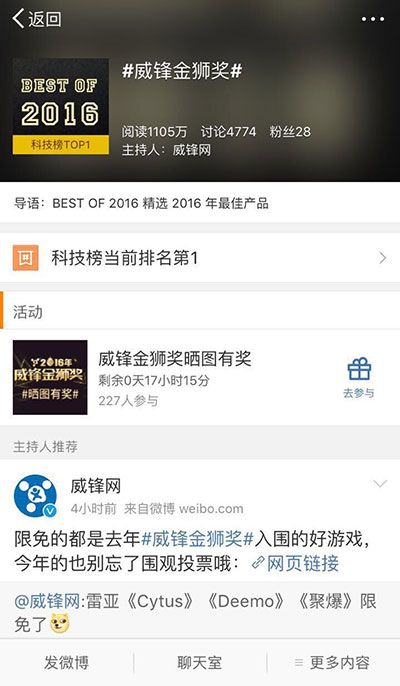 威锋网金狮奖投票火热 微博话题讨论超千万