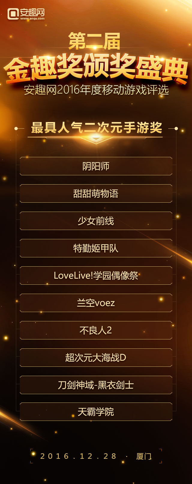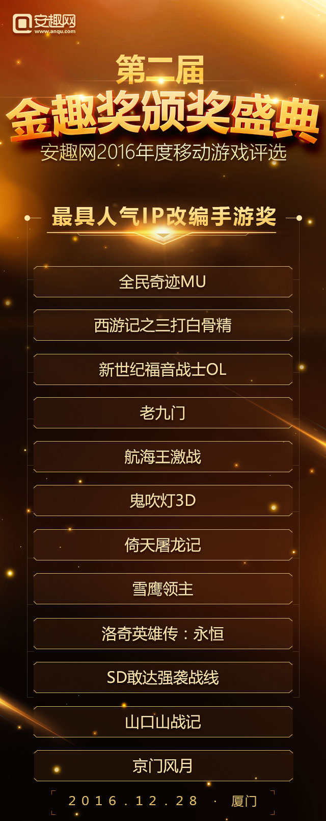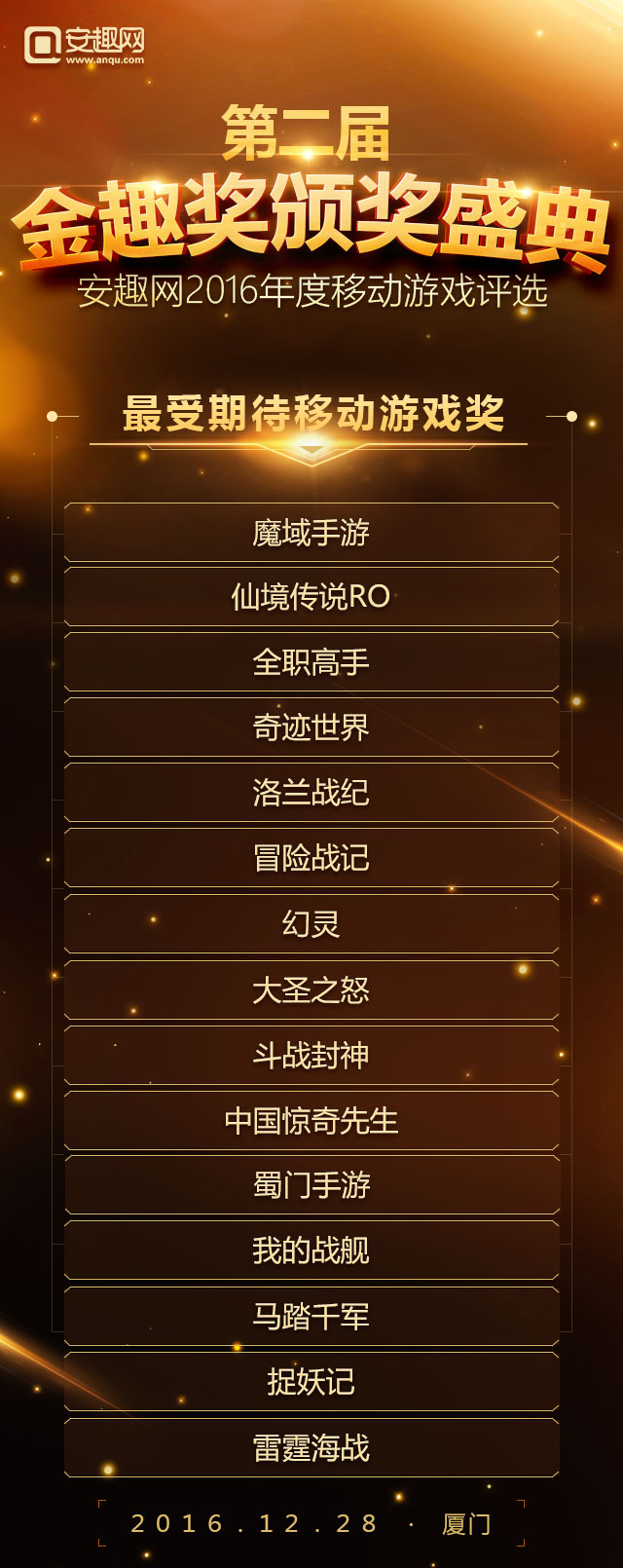 2016年度“金趣奖”中国移动游戏年度评选,经过长达一个月玩家线上投票以及资深评选团队投票,今日(2016年12月12日)正式公布名单。据统计参与到本次投票的用户超过50万,有效票数超过150万,共有31家企业、50款游戏摘得年度桂冠。 在第一届成功举办的基础上本届评选以玩家喜爱为出发点,紧跟行业热点趋势,奖项设置囊括年度热门移动游戏奖 、最受期待游戏奖、最佳口碑移动游戏奖、最具人气IP改编手游奖 、最具人气二次元手游奖、最具影响力游戏企业奖、最具实力游戏研发企业奖 、年度新锐企业奖 、最佳安卓模拟器共九大类奖项。评选活动自报名初期就受到广泛关注,据了解截至发稿已经有包括蜗牛、西山居、祖龙、龙图等国内数十家国内一线移动游戏厂商、百余款移动游戏报名角逐。 以下是第二届金趣奖获奖名单: 年度热门移动游戏奖: 最受期待移动游戏奖: 最佳移动游戏口碑奖: 最具人气IP改编手游奖: 最具人气二次元手游奖: 最具影响力游戏企业奖: 最具实力游戏研发企业奖: 年度新锐企业奖: 最佳安卓模拟器: 大厂霸占热门榜单 网易占据半壁江山 和去年的金趣奖相比,今年大厂依然受到玩家的追捧,其中以网易《阴阳师》、《梦幻西游》、《大话西游》、《倩女幽魂》四款产品均获得奖项,这足以说明网易游戏在2016年取得的成绩。另外腾讯游戏也有多款游戏上榜比如《梦幻诛仙》、《六龙争霸》。整个榜单呈现出的状态是优质手游表现突出,“IP”作用突出,而这种情况的产生恰恰证明了手游产业的品牌产品线已经有了成型的趋势。 多款二次元手游获成功 二次元手游或爆发 二次元手游爆发是这几年一直热议的话题,2012年盛大游戏代理的《扩散性百万亚瑟王》,再到这些年各大日系游戏都没能改变这一现状。时间到了2016年迎来了转机。网易的《阴阳师》大火之后,玩家对二次元的热爱程度超出了预期,本届金趣奖我们特别设立了“年度最佳二次元手游奖”奖项。从参与投票情况看,二次元很大一部分票数都投给了《阴阳师》这也足以体现出二次元用户的特性。 IP改编手游依旧是主旋律 和往届金趣奖相比,IP改编手游依旧是关注的对象,根据整个报名产品来看,半数游戏都是有IP的,而报名金趣奖“最具人气IP改编手游奖”奖项的游戏也超过30%。其覆盖的范围包括了动漫IP、端游改编IP、文学IP以及影视剧IP等各种领域,这间接说明IP依旧还是2016年手游选择的对象,而关于IP运作也逐渐从早年的简单授权演变成今天的“影游联动”、“漫游联动”等更加深层次形式。 手游产品多元化发展 手游市场细分化明显 早前有行业大佬称2016年的手游市场已经进入了红海,如果公司没有足够多的积累,建议加强细分领域的挖掘和发展。时至今日,我们发现整个手游的确是在往这个方面靠拢。如果你认为网易大获成功《阴阳师》的二次元还算是大的分类,那么近期备受CP关注的SLG类型呢?抛开这些具体的产品来说,从整个榜单来看,你会发现整个市场已经被切分成了多个领域。山寨手游泛滥的局面也有所缓解。 由安趣网主办,经过报名、玩家线上评选、专业评委评选等多个玩家,最终有31家企业、57款游戏摘得桂冠,这些获奖企业将在2016年12月28日出席在厦门举办的金趣奖颁奖盛典,我们欢迎五湖四海的朋友们共同见证。 活动时间:2016年12月28日16:30-19:00 活动地点:厦门帝元维多利亚大酒店(厦门市思明区环岛南路6699号) 合作伙伴: 关于金趣奖: 聚精品,由安趣网举办第二届金趣奖延续了第一届评选的风格,所有奖项均由广大游戏用户进行投票,旨在表彰在2016年整个移动游戏产业表现卓越的企业和产品。 关于安趣网: 安趣股份旗下——安趣网(www.anqu.com)正式成立于2012年,总部设立在首都北京。公司的创始团队核心成员来自各大一线知名媒体,拥有着手游媒体最强的编辑团队,专注原创精品内容,打造一流定制化的服务模式,铸造沟通无障碍的交流平台,秉承“用户为上帝”的精神理念!是国内领先的手机游戏门户网站。 |