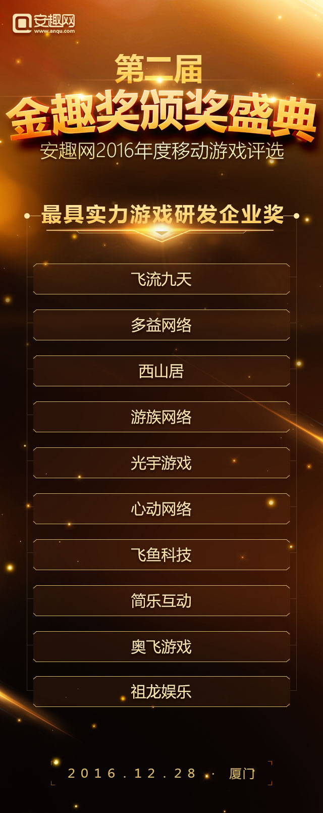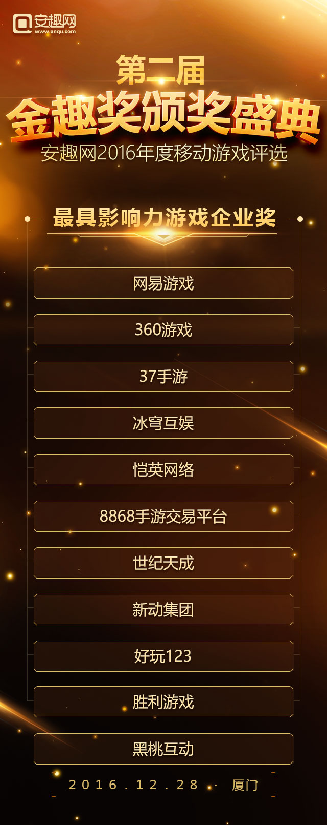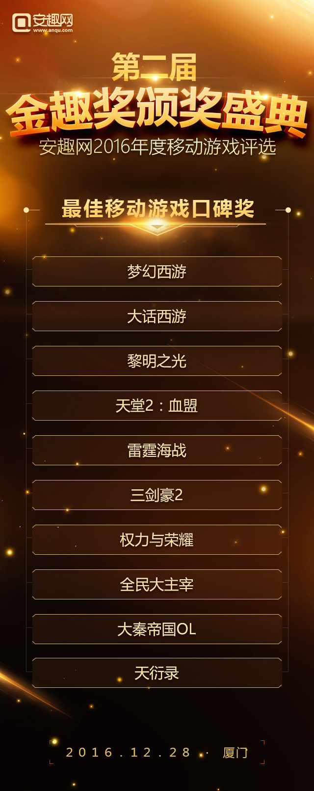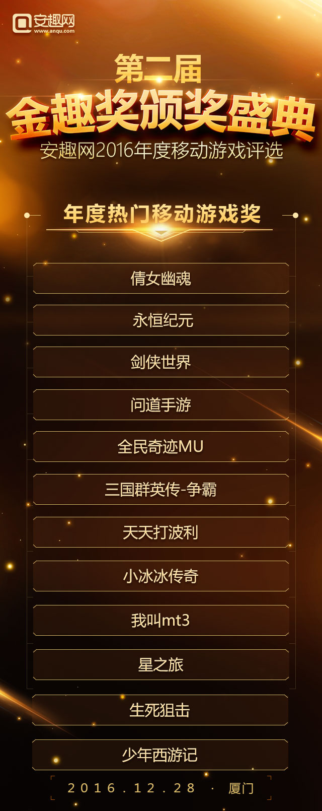 2016年度“金趣奖”中国移动游戏年度评选,经过长达一个月玩家线上投票以及资深评选团队投票,今日(2016年12月12日)正式公布名单。据统计参与到本次投票的用户超过50万,有效票数超过150万,共有31家企业、50款游戏摘得年度桂冠。 在第一届成功举办的基础上本届评选以玩家喜爱为出发点,紧跟行业热点趋势,奖项设置囊括年度热门移动游戏奖 、最受期待游戏奖、最佳口碑移动游戏奖、最具人气IP改编手游奖 、最具人气二次元手游奖、最具影响力游戏企业奖、最具实力游戏研发企业奖 、年度新锐企业奖 、最佳安卓模拟器共九大类奖项。评选活动自报名初期就受到广泛关注,据了解截至发稿已经有包括蜗牛、西山居、祖龙、龙图等国内数十家国内一线移动游戏厂商、百余款移动游戏报名角逐。 以下是第二届金趣奖获奖名单: 年度热门移动游戏奖: 最受期待移动游戏奖: 最佳移动游戏口碑奖: 最具人气IP改编手游奖: 最具人气二次元手游奖: 最具影响力游戏企业奖: 最具实力游戏研发企业奖: 年度新锐企业奖: 最佳安卓模拟器: 大厂霸占热门榜单 网易占据半壁江山 和去年的金趣奖相比,今年大厂依然受到玩家的追捧,其中以网易《阴阳师》、《梦幻西游》、《大话西游》、《倩女幽魂》四款产品均获得奖项,这足以说明网易游戏在2016年取得的成绩。另外腾讯游戏也有多款游戏上榜比如《梦幻诛仙》、《六龙争霸》。整个榜单呈现出的状态是优质手游表现突出,“IP”作用突出,而这种情况的产生恰恰证明了手游产业的品牌产品线已经有了成型的趋势。 多款二次元手游获成功 二次元手游或爆发 二次元手游爆发是这几年一直热议的话题,2012年盛大游戏代理的《扩散性百万亚瑟王》,再到这些年各大日系游戏都没能改变这一现状。时间到了2016年迎来了转机。网易的《阴阳师》大火之后,玩家对二次元的热爱程度超出了预期,本届金趣奖我们特别设立了“年度最佳二次元手游奖”奖项。从参与投票情况看,二次元很大一部分票数都投给了《阴阳师》这也足以体现出二次元用户的特性。 IP改编手游依旧是主旋律 和往届金趣奖相比,IP改编手游依旧是关注的对象,根据整个报名产品来看,半数游戏都是有IP的,而报名金趣奖“最具人气IP改编手游奖”奖项的游戏也超过30%。其覆盖的范围包括了动漫IP、端游改编IP、文学IP以及影视剧IP等各种领域,这间接说明IP依旧还是2016年手游选择的对象,而关于IP运作也逐渐从早年的简单授权演变成今天的“影游联动”、“漫游联动”等更加深层次形式。 手游产品多元化发展 手游市场细分化明显 早前有行业大佬称2016年的手游市场已经进入了红海,如果公司没有足够多的积累,建议加强细分领域的挖掘和发展。时至今日,我们发现整个手游的确是在往这个方面靠拢。如果你认为网易大获成功《阴阳师》的二次元还算是大的分类,那么近期备受CP关注的SLG类型呢?抛开这些具体的产品来说,从整个榜单来看,你会发现整个市场已经被切分成了多个领域。山寨手游泛滥的局面也有所缓解。 由安趣网主办,经过报名、玩家线上评选、专业评委评选等多个玩家,最终有31家企业、57款游戏摘得桂冠,这些获奖企业将在2016年12月28日出席在厦门举办的金趣奖颁奖盛典,我们欢迎五湖四海的朋友们共同见证。 活动时间:2016年12月28日16:30-19:00 活动地点:厦门帝元维多利亚大酒店(厦门市思明区环岛南路6699号) 合作伙伴: 关于金趣奖: 聚精品,由安趣网举办第二届金趣奖延续了第一届评选的风格,所有奖项均由广大游戏用户进行投票,旨在表彰在2016年整个移动游戏产业表现卓越的企业和产品。 关于安趣网: 安趣股份旗下——安趣网(www.anqu.com)正式成立于2012年,总部设立在首都北京。公司的创始团队核心成员来自各大一线知名媒体,拥有着手游媒体最强的编辑团队,专注原创精品内容,打造一流定制化的服务模式,铸造沟通无障碍的交流平台,秉承“用户为上帝”的精神理念!是国内领先的手机游戏门户网站。 |