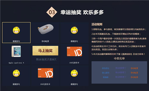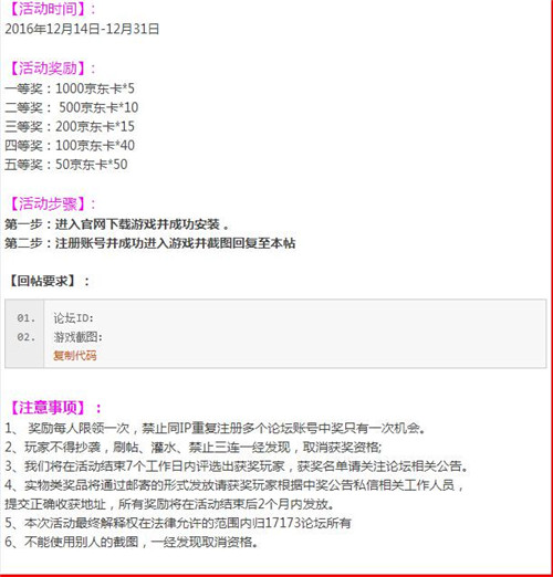 《盛唐剑侠》不删档测试开启以来,已经过了几天啦!各位玩家小伙伴们也非常的支持咱们的游戏,小编在这里代表若水全体员工感谢玩家们的大力支持。 今天呢,小编主要向大家介绍的是所有人都非常关心的活动大礼包啦!嘿嘿,是不是很期待呢! 首先介绍的是与两大媒体合作的媒体活动啦!《盛唐剑侠》与17173合作举办了一场论坛活动。 小伙伴们只要下载咱们《盛唐剑侠》的游戏,注册进入后截图回复到该帖子上就能获得一次中奖机会哦!此次活动一共设置了5项大奖,一等奖是价值1000元的京东卡,其次的也都是相应金额的京东卡哦!嘿嘿嘿,可以尽情的买买买啦!并且设置的中奖名额也是相当的多呢!千万不要错过啦! 不仅如此,小伙伴们还可以领取17173的特权礼包,我们特地为合作媒体设计了专属道具,狂拽酷炫吊炸天!快来领取吧! 接下来介绍的是叶子猪的专题活动,嘿嘿,大奖可是多多的哒! 此次我们在叶子猪设置了专题活动页面,小伙伴们可以登录叶子猪进行查找,抽奖,同时可以领取叶子猪的特权礼包,获得叶子猪专属道具。 参与叶子猪设计的小游戏就可以获得抽奖机会哦!iPad mini ,京东卡,定制移动电源,就等着你来领呢! 小伙伴们还在等什么呢!快来参与游戏,赢取丰富大奖,专属礼包吧! 关于若水: 苏州市若水网络科技有限公司--中国民族网络游戏新势力,革新视野的绿色网游创造者,致力于国产网络游戏的技术革新和新型网络游戏的研发。苏州市若水网络科技有限公司创立于2013年,是一家集大型多人在线网络游戏(MMORPG)研发、全国性网络销售、网络游戏运营和地面宣传推广等为一身的综合性高新技术企业。 了解更多相关信息,请前往http://news.yzz.cn/ku/stjx/ |