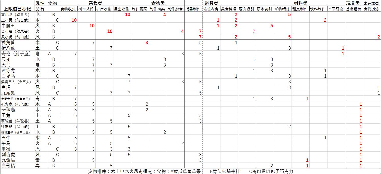“装备全靠打怪掉落 轻松成就游戏高手“,曾几何时,商城道具全掉落成为游戏产品良心不坑的广告语。《萌宠大爆炸》作为一款全球同服的绿色健康游戏,本身具有较低的付费深度,更没有S级宠物抽取等氪金元素,高级抓捕球等道具也能在现实探索中从资源站获取。随着12月17日,《萌宠大爆炸》引入了“资源采集”和“道具制作”系统,让道具的获取途径更加丰富。 新版发布后,,有心的冒险家们随即整理了有关于玩具制造玩法相关的信息,现在我们就来一起分享一下来自深圳的玩家“Alitra”提供的玩宠心得吧! 基础组装1(B宠必有专属技能) 5欢乐度+100星尘=3磁铁/铁锹/鱼竿/斧头(作用:采集) 采集(获取制作物品的初级原材料,同时只可激活一块领地) 伐木场:欢乐度+1斧头+树木采伐1-10=木头 渔场:??欢乐度+1鱼竿+食物收集1-10=食物 矿石场:欢乐度+1铁锹+矿产收集1-10=铁矿 星辰:??欢乐度+1磁铁+星尘收集1-10=星尘 食物类技能 制作蔬菜1:欢乐度+100星尘+300食物=黄瓜 制作杂食1:欢乐度+100星尘+300食物=骨头 制作肉类1:欢乐度+100星尘+300食物=鸡肉卷 道具制作 捕器制作1:欢乐度+750星尘+375木头+188铁矿=初级抓捕球 捕器制作5:欢乐度+600星尘+5高级木材+10高级铁锭+中级球合成配方=中级抓捕球 培植养育1:欢乐度+500星尘+10初级木材+150铁矿+1便携孵化器配方=便携孵化器 萌宠吸引1:欢乐度+500星尘+300木头+10初级铁锭+1萌宠召唤器配方=萌宠召唤器 萌宠吸引2:欢乐度+2500星尘+5方糖+5引诱剂+1诱宠香水配方=诱宠香水 美食料理1:欢乐度+2500星尘+5苏打水+5薄荷+1经验薄荷配方=经验薄荷 材料制作 矿物精炼1:欢乐度+500星尘+450铁矿=初级铁锭 矿物精炼3:欢乐度+200星尘+250铁矿=高级铁锭 原木切割1:欢乐度+500星尘+900木头=初级木材 原木切割3:欢乐度+200星尘+500木头=高级木材 甜点制作1:欢乐度+200星尘+80食物=方糖 萌宠吸引1:欢乐度+200星尘+200食物=引诱剂 饮料制作1:欢乐度+200星尘+80食物=苏打水 本草研磨1:欢乐度+200星尘+200食物=薄荷 附表: |
