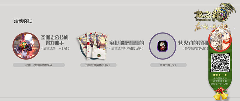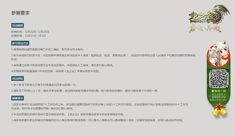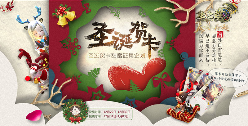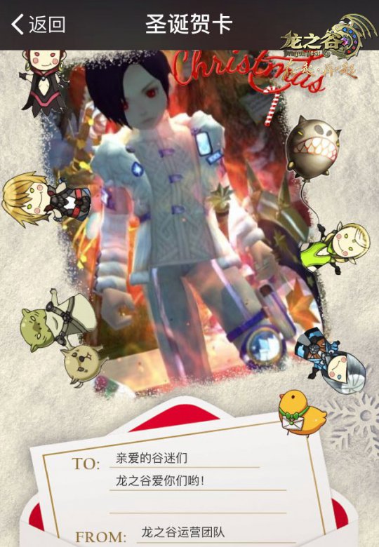 烟花的璀璨,是快乐的开始;流星的闪亮,是愿望变现实……你听到了吗?圣诞的钟声已经响起,就让我的思念,随着这漫天飞舞的雪花一起,飞向你!在刚刚过去的圣诞节里,不知道各位谷迷们有没有对你们最重要的人送上你的圣诞祝福呢?你们又写下了哪些温馨而浪漫的祝福话语呢?《龙之谷》圣诞贺卡正在甜蜜征集ING,如果你还没来得及将那些说不出口的悄悄话发送出去,那就来定制一张专属于你的基谷贺卡,让《龙之谷》成为你的圣诞老爷爷,为你送出你的祝福吧! 甜蜜收集,让基谷成为你的圣诞老爷爷 在《龙之谷》圣诞贺卡甜蜜征集活动中,制作完成的贺卡,需要点击投稿并且填写真实有效的收件人信息(包括姓名、电话、邮寄地址等),然后再进入到PC端的贺卡征集活动页面,等待官方的投稿审核通过之后,才算参与活动成功。而审核通过的贺卡将会自动显示在贺卡征集的活动页面,由《龙之谷》大于等于60级以上的玩家们进行投票。在12月31日至1月3日期间,收集到甜蜜值前100的玩家,就可以让《龙之谷》成为你的圣诞老爷爷,为你寄出你的《龙之谷》专属实体圣诞贺卡啦! 甜蜜成果,福利满满的圣诞贺卡 《龙之谷》圣诞贺卡甜蜜征集活动,除了为甜蜜值前100的玩家们送出实体贺卡之外,还有福利满满的圣诞节礼物一起送给大家。在本次的活动中,获得甜蜜值第1~10名的玩家,可以在游戏里得到一等奖---圣诞老公公的得力助手奖项,获得“收到礼物很高兴”的游戏动作哟;只要是参与过投稿并且审核通过的,也可以获得游戏内道具“圣诞节袜子”的福利奖励!甜蜜的果实,是需要大家一起来分享,就让我们一起在这个冬日,构筑一个最甜蜜幸福的梦吧! DN专属实体贺卡即将出炉,圣诞贺卡甜蜜征集中!《龙之谷》与你一起,在这个温馨而浪漫的凛冬,将美好的祝愿与幸福传递下去! 《龙之谷》燃战·觉醒新版本魅惑登场! 舞娘觉醒战力爆发!噩梦进阶挑战再起! 大陆探险命运旅程!圣诞活动捕捉美景! 全城装扮欢庆圣诞!圣诞时装银河之旅! 专属战衣舞力全开!圣诞套装闪耀星空! 巨龙变身鏖战沙场!沙龙精灵再续前缘! 心动兔宠激萌伙伴!人宠新衣风尚尽显! 小国王PV感动常在!系列漫画点燃战意! 了解更多相关信息,请前往http://dn.yzz.cn/ |
