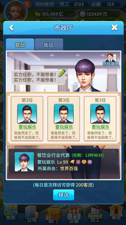 众所周知,《大富豪3》是一款商战模拟经营类手游,以买地开店起步,辅以投资股票,买船远航等一系列商业投资的玩法广受玩家喜爱。但大家知不知道,《大富豪3》还是一款励志游戏? 员工励志 每位员工都有他自己的座右铭喔,例如上图里的“做最坏的打算,做最多的努力”、“我可以接受失败,但绝对不能接受未奋斗过的自己”。每个员工都为了成为BOSS眼里的最佳员工而不懈努力着!看到这么努力的员工,各位BOSS是不是也豪情万丈,想带领这么一帮努力奋斗坚持不懈的员工,创下自己的商业帝国?加油吧! 越升职越努力 这些员工为了升职付出了很大的努力,升职成功后,也完全没有放松自己啃老本的打算喔! 有的豪情万丈,自信地跟自己的BOSS说——年底的最佳员工,我当定了! 有的则反过来鼓励被自己比下去的同事——被我打败的时候要赶紧站起来喔! 有的毫不掩饰自己的自信——我这么有才华的人,实在难以低调啊~ 有的会买买买来奖励自己——买个包包,犒劳一下自己。 有的则乘机向BOSS表白——跟着董事长走,总不会吃亏! 这么努力的员工,各位BOSS唯有不停地拓宽自己商业版图,才能回报他们的忠心啊! 越努力越耀眼 除了员工,其实BOSS你们也很努力励志啊!《大富豪3》里有许多勋章,不知道各位BOSS集齐了多少? 点击个人头像,进入个人版图,就可以查看个人勋章啦! 有的BOSS通过商会,当上了商会会长,带领会员走向辉煌。有的甚至当上了行业代表,在《大富豪3》的历史里留下属于自己的精彩一抹! 点击游戏页面的事务图标,进入市政厅,到达一定等级后,你就可以观看《大富豪3》历史上各届的行业代表,有属于他们的照片墙喔! 以下是个示范图↓ 更多用心小细节 除了以上一系列的励志小细节,《大富豪3》其实还有许许多多小细节等待着各位BOSS去探索! 小编这里抛砖引玉一下,大家一起来找小细节! 比如,我们建立了店铺后,每次进入店铺时,会有对应的欢迎音效! 再比如,当我们买了车后,将其设置为自己的座驾,每次进入游戏时,系统会自动广播你开着什么豪车进来的!同样,每当你取得什么成就时,系统也会满世界给你广播,增加你在《大富豪3》世界里的知名度! 再再比如,股票中心的每支股票详情里,时不时会有对应的版块资讯弹出,预示着每个股票是升,是跌,你又有没有留意过呢? 甚至,别人来拜访你的梦想岛,你都可以自己设置个性欢迎语! 其实《大富豪3》里每个版块都有非常多的小细节,因为研发团队希望呈现给大家更完美的《大富豪3》,希望大家能在《大富豪3》的世界里玩得开心! 官方网站:http://d3.yaowan.com/ 官方微信:bizgame3 了解更多相关信息,请前往http://sy.yzz.cn/ku/dfh3/ |