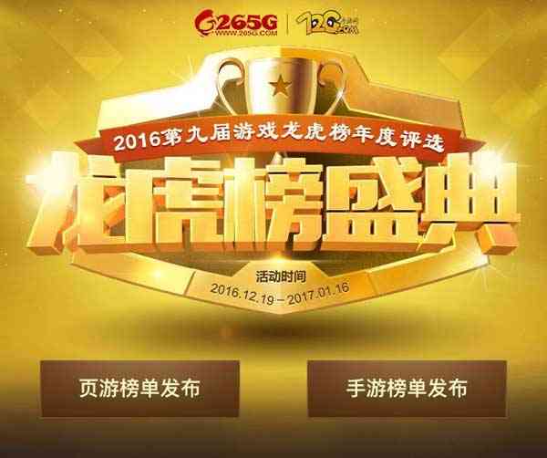 第九届游戏龙虎榜经过了历时近一个月玩家与评委们的投票评选,截止2017年1月16日24:00投票阶段结束。各项榜单结果已经产生。本届游戏龙虎榜由265G和72G联合举办,共设立了七个页游类奖项和六个手游类奖项。现将各奖项获奖名单公布如下: >>>点击访问第九届龙虎榜榜单发布页(http://lhb2016.265g.com/rank_list) 页游榜: 最受玩家喜爱页游:赤月传说2、雪鹰领主、魔法王座、蓝月传奇、范伟打天下 最受期待新网页游戏:代号∞、刀剑乱舞ONLINE、神仙劫 最佳画面网页游戏:九阴绝学、剑侠情缘2网页版 最佳IP改编网页游戏:锦衣夜行、盗墓笔记、武神赵子龙 页游风云人物(排名不分先后):罗旭(37游戏)、 贺毅(迅雷牛X)、刘天明(51游戏) 最受玩家喜爱页游平台:37游戏、9377平台、趣游(360游戏) 最具潜力网页游戏平台:2217游戏 手游榜: 最佳手游运营商:无端科技 最佳手游:永恒纪元 最受期待手游:生死狙击 最佳IP改编手游:生死狙击 最佳画面手游:生死狙击 最具创意手游:九阳神功起源 关于游戏龙虎榜: “265G网页游戏龙虎榜”设立于2008年,在业内有着极高的影响力,也是第一个专为网页游戏准备的榜单奖项,为了真实反映每年行业的游戏变化,所有的入围结果均是根据玩家的实际票数,投出当年叱咤风云的游戏。2106年新增手游奖项评选后,更名为“游戏龙虎榜”。 |