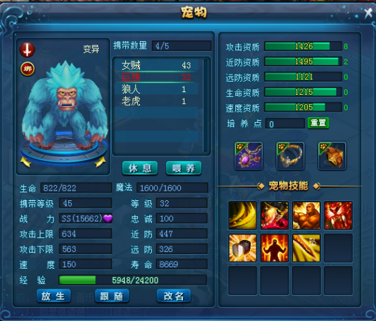 《画江山》做为一款Q版回合制网游,一直以清新可爱的画风吸引着广大玩家。在这个神奇的世界里漫游,自然少不了一直陪伴在身边的激萌宠物啦。可是多达数十种的宠物对于一些刚刚接触游戏的萌新玩家来说,恐怕是难以取舍的。在此,小编就推荐一些初期(50级前)十分实用的宝宝,帮助萌新们度过这段too young too simple sometimes native的时光... 当然,一来就买神兽的壕就请华丽丽的无视我吧... 对于新手玩家来说,你的第一只神级任务宠绝对是15级就可以携带的女贼了。 女贼: 实用指数★★★★ 颜值指数★★★ 生存指数★★ 追击,这就是女贼人见人爱的资本... 女贼可以说是《画江山》玩家人手一只的宝宝了,技能多,资质高,尤其追击技能的实用性,可以帮助你快速拍飞那些恼人的小怪,简直没有理由不爱她。 到了25级这个阶段,小编推荐野熊作为这一时期的主力肉宠。 野熊作为前45级第一血宠,其实用性保证玩家在挑战“远古妖怪”以及其他高难度活动中的生存。就拿“远古妖怪”任务来说,前期必定是5血宠开场,其重要不言而喻,一只好的野熊可以用很长时间。 野熊: 实用指数★★★☆ 颜值指数★☆ 生存指数★★★★ 45级之后,巨猿的肉,狼人的高速及保命,都是生存的有力保障。接下来就分析这两个宠物的优势。 狼人乃是平民玩家第一选择,自带高爆,保命,压制,攻击高,速度高,不俗的血量,可谓上得了厅堂,下得了副本,打得过任务,斗得过BOSS。这么全能的宠物怎么能不加入后宫呢? 狼人: 实用指数★★★★ 颜值指数★★ 生存指数★★★☆ 再说说巨猿。作为一只血宠,不管你信不信,同资质同等级下,就算成长颜色低于野熊,但是到最后血量还是巨猿更高,因为45级宝宝成长颜色标准和25级的宝宝是不一样的。咱猩猩哥天生带高强,不管是生存还是输出都很不错,十分推荐萌新们培养。 巨猿: 实用指数★★★☆ 颜值指数★ 生存指数★★★★ 三十功名尘与土,八千里路云和月。 金戈铁马,气吞万里如虎; 壮志凌云,势拔山河似蛟。 红袖赴琼阁,执手《画江山》! 《画江山》官方微信:TQ_huajiangshan 了解更多相关信息,请前往http://www.yzz.cn/game/hjs/ |