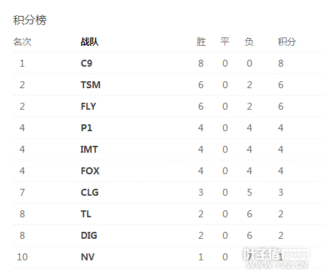 这是目前北美LCS常规赛队伍的积分名单。有趣的是,在排名前3的队伍中,一共只有1名韩籍外援选手(C9上单Impact);而拥有最多韩国选手的两支队伍DIG和NV则排名垫底。