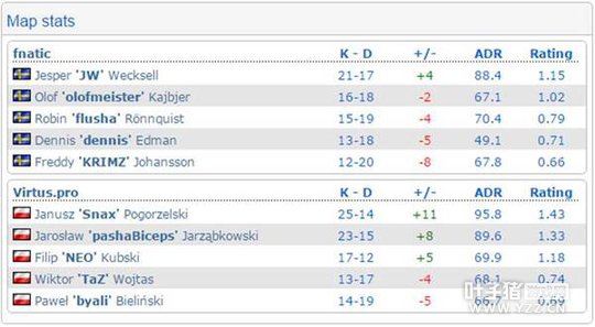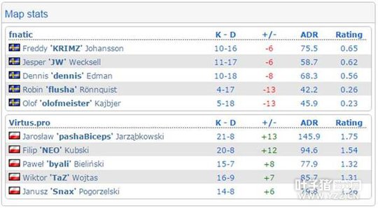 第一个长枪局,VP两人在AB两点侦查,三人控制中路。不料Fnatic前压侦查先打掉了AB两点的VP队员,中路三人硬着头皮从拱门进攻A点由于没有道具配合输掉第一分。然而即使Fnatic三人重防中路来针对VP的战术,个人能力上的不足也让Fnatic难以招架VP的攻势,好在JW和flusha各有发挥稳住了局势,上半场9:6,VP领先。 下半场手枪局,Fnatic作为进攻方粗糙进攻A区,byali一把usp在远点连续收割人头,中路的JW也被截断无法提供支援,最后无奈输掉手枪局。VP借机拉大比分到12:6,长枪局依旧是重点设防中路的战术,依旧是Fnatic败下阵来。 Fnatic虽然一直在努力追分,olof也终于找到了一点点节奏,但无奈比分差距太大,留给Fnatic的时间已经不多。最终VP以16:9轻松结束第一张地图先拿一分。