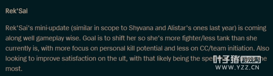 近日,Riot首席游戏设计师Meddler在美服LOL论坛发帖,更新了几则未来的预期游戏改动方向。其中,关于虚空遁地兽-雷克塞的改动计划引起了外国网友的广泛关注。以下为Meddler的原帖: “雷克塞的迷你更新(更新规模可能类似此前的龙女和牛头)能带来不错的游戏体验。我们的目标是将她转变成一个战士,而非现在的坦克。我们将增加她的击杀潜力,而非单纯的控制/开团。我们也将增加她的大招的满足感,那可能会是变动最大的一个技能。”