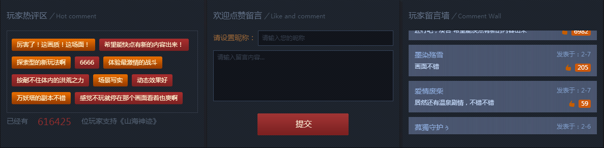 对面的壮士看过来! 你们期待已久的国战诚意大作《山海神迹》携官网正式上线啦! 要说大伙对这款游戏的期望有多高?不如看看以下数据! 在游戏未上线期间,共有1276名玩家预约了《山海神迹》! 更是有6W+的玩家对《山海神迹》表示支持! 翻开玩家热评区,尖叫声分分钟响彻天际! 作为玩家们的“百宝箱”,官网几乎“无所不能”! 官网banner板块 对于刚接触游戏的玩家,可以通过观看官网上的宣传视频快速了解游戏! 重点资讯板块 注意了!最新最全官方的活动都在这里!想要参与,只要轻轻一点就可以! 攻略、视听板块 想要快速了解职业特色?想要快速查找副本攻略?请戳这里! 除了这些,还有更多精美视频和壁纸等你来下载! 左侧菜单栏 这里俗称“老司机”通道,不仅有你想要的游戏资料,还有各种“小道消息”,如玩家交流论坛,礼包中心,问题反馈中心等。 你若觉得还不过瘾,还可以加入Q群、关注微博或者扫码关注微信公众号与游戏主创“面对面”交流! 若你想“调戏”一下萌萌的客服妹子,请不要错过这里! 游戏下载与账号注册 最重要的一点——看完官网介绍,不要忘了点击官网左上方的“游戏下载”和“账号激活”,亲自体验一下游戏! 废话不多说,赶紧来吧! 更多精彩内容,敬请关注《山海神迹》(http://shsj.56cy.com/) 了解更多相关信息,请前往http://news.yzz.cn/ku/shsj/ |