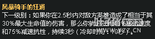 女警适合飓风这件装备,亚索的E技能能够加快充能,剑姬的Q技能能够回血还能触发嗜血,卢锡安的被动能够很好的加快充能。 总结: 这个天赋总的来说适合一些有位移、攻速高、很需要移速的AD英雄,当然在前期也能增加一些续航能力。 战争热诚