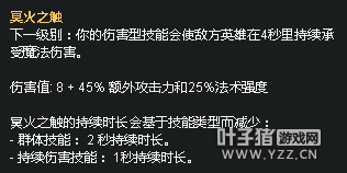 卢锡安的被动能够加快叠加速度,EZ的Q技能能够触发热诚,武器被动增加攻速并且武器就是一个靠普攻输出的英雄,卡蜜尔增加热诚的同时热诚也能增加Q技能的伤害。(并且卡蜜尔和武器都有技能重置普攻)。 总结: 适合一些靠普攻并且灵活的AD英雄,热诚增加的攻击力也能够增加技能的伤害。同时也适合一些能够重置普攻的英雄。 冥火