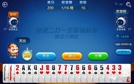 3月18日,由工信部、文化部、协会以及与游戏业务有关的主管部门领导和业内专家组成的专家评选委员会投票评选产生的2016年度中国游戏行业“金手指”奖在浙江绍兴颁布,联众一举揽获四项大奖,其中以经典民间棋牌游戏“斗地主”为原型的《竞技二打一》荣获“2016年最受期待手机游戏”奖,“国粹”项目《单机麻将》获评“2016年度优秀网络游戏”,此外,联众公司和董事长杨庆亦分别获得“2016年度优秀企业”奖和“2016年度优秀企业家”殊荣。 (联众《竞技二打一》登陆界面) (联众《竞技二打一》比赛界面) 2016年,联众获国家体育总局棋牌运动管理中心首批“竞技趣味棋牌赛事战略合作伙伴”授牌,并率先于9月推出线上产品——《竞技二打一》,展开“全国竞技二打一扑克锦标赛”的线上选拔,不仅为趣味棋牌竞技化发展提供有力支撑,更让选手体会真正的竞技乐趣,在对局较量中赢取国家体育总局棋牌运动管理中心统一发放的竞技二打一技术等级分(即大师分),获评“五星牌手”到“终身特级大师”等牌手等级称号,并向“全国竞技二打一扑克锦标赛”发起冲击。 (联众《单机麻将》游戏界面) 《单机麻将》是联众旗下的一款经典游戏,产品基于国粹麻将的传统风格,研发出“两人对决”、“加倍”等有趣模式,令玩家感受到更丰富的竞技乐趣和游戏惊喜。游戏的设计维系着中国棋牌的国粹精髓,新颖独特,成为产品备受欢迎的一大亮点。 从1998年发展至今,联众旗下游戏业务涵盖联众大厅、联众扑克世界等多个板块,共计200多款在线游戏,7亿多注册用户,成为联众智力运动生态圈重要的流量入口和用户基础所在。2017年联众将继续秉承弘扬中华传统棋牌文化的理念,为大家带来更丰富多元的棋牌竞技体验,不断扩增游戏内容和参与形式,用饱满热忱的态度和专业细致的服务,传递全方位的智力竞技体验。 |