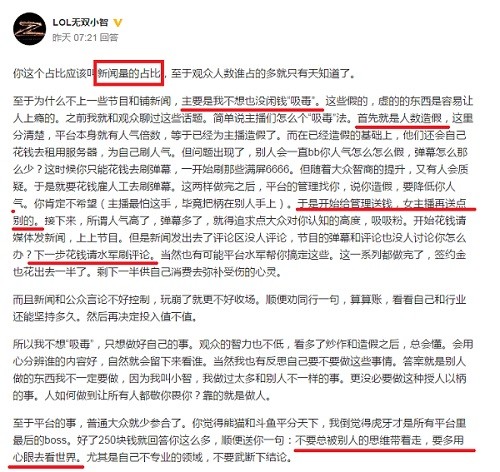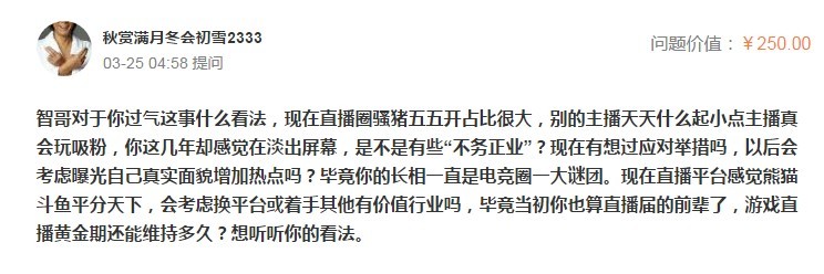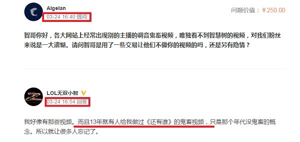 最近,一直在家静养的小智和粉丝在微博上互动颇多,可能觉得发微博和粉丝交流不彻底,小智就趁机开通了微博问答,并表示知无不言。 而网友也确实犀利,上来第一个问题就直问小智对于过气什么看法。 像这种提问,如果是一些鸡贼点的博主肯定就不回复了,但小智还是言出必行的,不仅没敷衍回答,还逐条详细回应了网友的问题。 小智在答案里给大家解释了为什么有些人看上去那么“火”,原因就是雇佣了大量的水军。至于平台问题,就像小智说的,谁笑到最后谁才是赢家。 看着小智第一条回答就这么走心,网友的提问热情一下子就上来了。这次网友问了小智为什么没有鬼畜视频,小智也是马上回复了网友的问题。 最后估计网友的问题实在太多了,小智自己已经回应不过来了,所以只好发微博解释下原因。毕竟如果每条问题都回答的话,估计小智一天到晚就只剩码字了。 其实如果第一个提问的网友细心点话,看看这提问量和回复就可以知道答案了。过气?不存在的! 了解更多相关信息,请前往http://lol.yzz.cn/ |