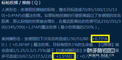 豹女Q技能介绍 Q作为豹女的核心输出技能,人形态Q拥有1.2的AP加成,而美洲狮形态Q加成则高达1.5,不分孰强孰弱,只是证明AD豹女是完全可行的并且拥有不俗的伤害。