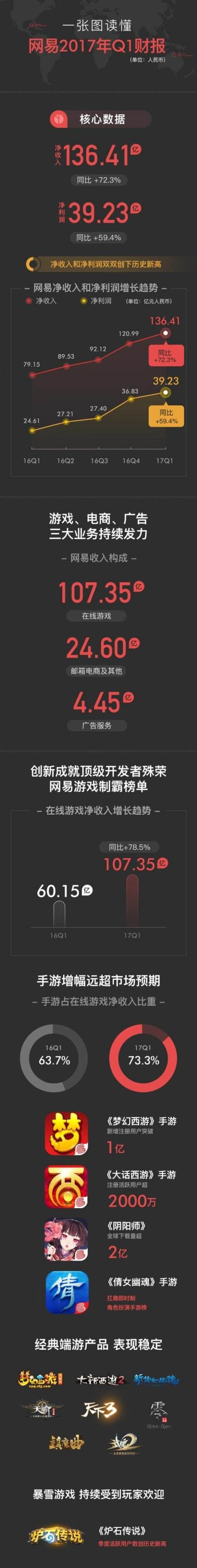 网易(NASDAQ:NTES)今天宣布了公司截止到2017年3月31日的第一季度未经审计财务业绩。数据显示,网易一季度净收入为136.41亿元(19.82亿美元),同比增长72.3%,环比增长12.7%;归属于网易公司股东净利润为39.23亿元(5.70亿美元),同比增长59.4%,环比增长6.5%。网易季度净收入和净利润连续创历史新高。 其中在线游戏服务净收入为107.35亿元人民币(15.60亿美元),同比增加78.5%。 手游净收入贡献占比提升 《阴阳师》全球下载量已达2亿 在本季度,来自于手游的净收入占在线游戏服务净收入的73.3%,较上一季度与去年同期均有提高。上一季度和去年同期该占比分别为64.4%和63.7%。 本季度发布的手游新品包含了《镇魔曲》手游、《大话西游热血版》和《光明大陆》等,玩家反馈良好。 而先前发布的手游产品,诸如《阴阳师》、《倩女幽魂》手游等同样表现良好。本季度,《阴阳师》在日本发行,进一步拓展了海外市场。截止至2017年2月20日,全球下载量已达到2亿。 “在自研手游业务的带动下,我们第一季度的业绩令人瞩目。我们不断进行内容创新,用户数量持续增长,”网易公司首席执行官兼董事丁磊先生说,“第一季度,我们新发布了多款手游产品和端游资料片,继续推进广告业务的商业化进程,并进一步开拓我们的电商业务。我们一直在引进国外的优秀游戏作品,以丰富国内在线游戏市场。我们非常荣幸,在四月对《我的世界》进行了首轮封测。同时,我们正在通过自主发行,将热门游戏《阴阳师》和《光明大陆》推向海外。” 暴雪游戏持续受到欢迎 《炉石传说》活跃用户数再创新高 本季度财报显示,网易代理自暴雪娱乐的产品如《守望先锋》和《魔兽世界》同样做出了不小的贡献。 其中,代理自暴雪娱乐的《炉石传说》季度活跃用户数更是创下了历史新高。在2017年4月,《炉石传说》还发布了最新扩展包《勇闯安戈洛》,受到用户欢迎。 “追求卓越品质一直是我们各项业务发展的基石。在传媒业务上,我们投入了大量资源, 进行内容和产品层面的提升。我们的电商业务,如以跨境业务为主的综合型电商平台网易考拉海购和自营品牌网易严选保持着健康的发展态势。我们希望通过这些尝试和努力,不断扩大用户群体,提升用户体验,保持我们业务的持续发展,”丁磊先生总结道 |