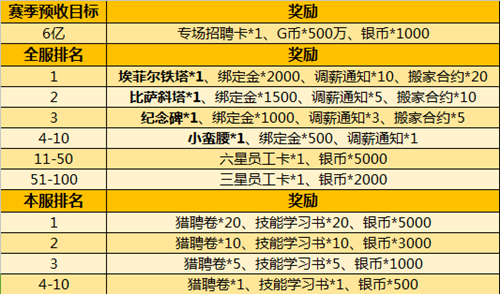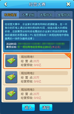公平竞技,极致规划,赢埃菲尔铁塔!主打超现实模拟经营商战的手游的《大富豪3》首届经营大赛(持续7天,每月一届)即日烧脑上演!大赛获胜者即可将顶级建筑埃菲尔铁塔带回家!这次的经营大赛地图完全独立,每位参赛者将获得相同的资源和完全平等的规划操作空间,以创造最大预收为赛事目标,妈妈终于不用担心我被土豪欺负了! 大赛地图 独立地图(富裕指数固定为8),只在活动时间内开放。进入自己的地图后,玩家只能进行建造和拆除两种主要地图规划操作。所有空地默认已被玩家购买,不能弃置,不算入公司购地数量。初始地图系统会默认放置一定数量的店铺/建筑,它们属于玩家,但不能主动拆除。 大赛资源 活动开始时,系统会给玩家分配一定的经营点(仅供活动地图使用)。建造店铺、公益建筑、环境设施(高级设施不可建造),会消耗一定经营点(不足时不可建造),拆除则全额返还。 店铺&公益建筑 玩家建造的店铺,默认为满级、满货状态,建造时需要拥有对应数量的员工,不足则不可建造。 建造时店铺店员数量为0(玩家可随意调入调出),主管为满。店铺不需要缴纳日常维护费,不消耗货物,也不产出经营点或G币。 建造公益建筑时不需要建筑图纸,建造时主管数量为0,需要玩家调任,建筑不需要缴纳日常维护费。 大赛员工 系统会为玩家分配一定数量的员工,仅供活动地图中调配,不算入公司员工数量。所有员工日薪为0、满级、满星、满技能、无爱好。 大赛奖励 1.每届大赛会设置一个固定目标预收值(本届为6亿),达到目标预收,活动结束后可获得一定的奖励; 2.系统根据参赛玩家的经营预收进行本服和全服排名(系统会为每位玩家提供三块存档地图,排名时取其中经营预收最高者),活动结束后按排名分配奖励。 好喽,关于万众瞩目的《大富豪3》首届经营大赛的介绍就到这里了,各位老板赶紧去游戏内参加活动,创造属于你自己的商业奇迹吧~ 《大富豪3》官方网站:http://d3.yaowan.com/ 《大富豪3》微信公众号:bizgame3 了解更多相关信息,请前往http://sy.yzz.cn/ku/dfh3/ |