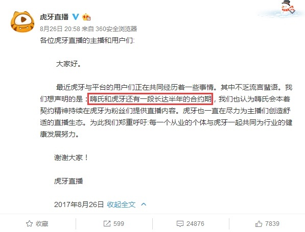 相信有关注《王者荣耀》直播的小伙伴应该会发现,刚刚签跳槽斗鱼不久的嗨氏这几天突然停播了。按理来说,在跳槽到新东家后应该连播一段时间,证明自己的实力和人气才对。不过嗨氏在转到斗鱼后仅仅播了几天便停播,这究竟是什么原因导致的呢? 根据嗨氏本人表示,停播是由于高烧加上身体各种病因正在住院治疗。从8月31日开始到9月3日,基本每天都会发一条类似的微博: 乍一看,嗨氏这次停播的理由似乎很充分且合理,但让人感到蹊跷的是,嗨氏的新东家斗鱼目前已经删除了一切有关于嗨氏跳槽到斗鱼的内容: 从之前的种种疑点来看,再加上之前虎牙在微博上表示嗨氏还有半年的合约期,种种现象都表明了一点:嗨氏应该是受到了虎牙的制裁! 除了真爱粉之外,大部分人都认为现在嗨氏停播是因为遭到了虎牙的制裁。因为虎牙的直播诉讼,现在还是在诉讼期间不得在虎牙之外的平台直播,所以新东家斗鱼也不敢对他施以援手。但嗨氏直到目前还以生病做幌子拒不承认事实,于是有网友在嗨氏微博下方表示: 最为打脸的是,今天下午嗨氏的病突然好了,而且还曝光了自己的北京之行: 对于这条动态,网友们也表示: 不知道对于嗨氏的这种做法,各位小伙伴怎么看呢? |
