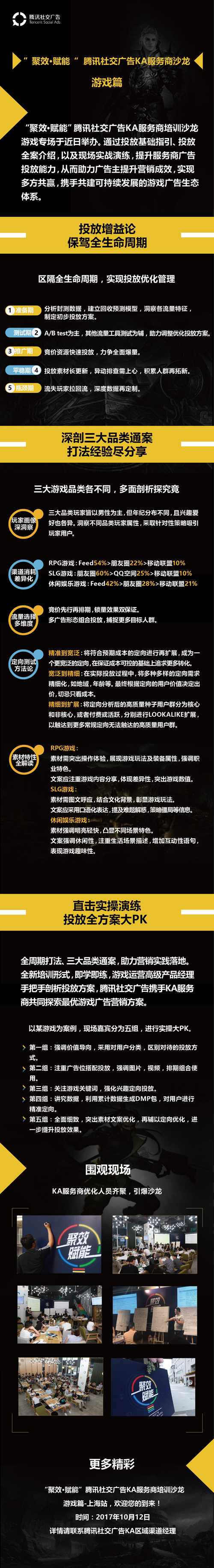 近期,腾讯社交广告启动以“聚效·赋能”为主题的KA服务商培训沙龙。针对游戏行业的培训刚刚在深圳、北京落幕,并即将登陆上海等地。