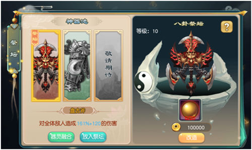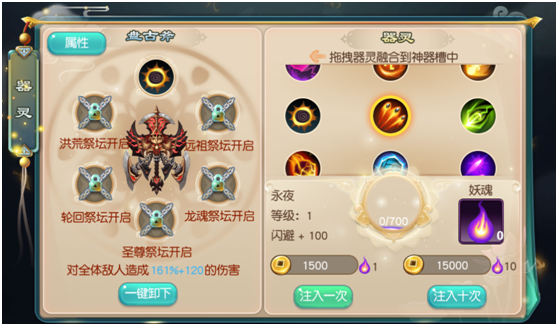 中国神话有十大神器,分别为东皇钟、轩辕剑、盘古斧、九黎壶、昊天塔、伏羲琴、神农鼎、崆峒印、昆仑镜、女娲石。任意一件神器都拥有着无与伦比、毁天灭地的能力。得到任何一件神器都能够呼风唤雨,称霸一方。 《炼妖记》中,玩家达到34级,才能掌握神器的力量,让其为己所用,来面对更加强大的敌人! 想要发挥神器的最大威力,更需要坚持长久的培养。神器在战斗中为玩家提供一个额外的主动技能,对神器进行献祭会增加神器在战斗中的威力。献祭需要消耗金币和祭坛灵石,每次献祭神器提升1级。 此外神器可以融合器灵,器灵有很多种属性,融合之后将为主角增加相应属性。器灵每献祭10次需要改造1次,改造需要消耗祭坛造化石和金币,改造之后将为神器增加1个槽位,槽位越多可融合的器灵就越多。每个器灵可以进行升级,升级需要消耗金币和妖魂,妖魂可以在炼妖塔中大量获得。升级之后会增加器灵的属性。 妖灵变身 御三界 谈情说鬼 齐修仙 与你的道侣一起携手畅游三界!修仙成道之路等着你来开启! |