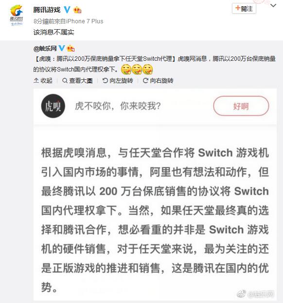 此前刚报道过台媒关于Switch要进军国内的消息,并且虎嗅网也拿到了消息,称Switch的确要把Switch引进国内市场,并且要和腾讯联手。 据报道,腾讯明年也将代理Switch进入国内市场,虽然期间阿里也有过想法和动作,但是最终腾讯以200万台保底销售的协议将Switch国内代理权拿下,不仅是硬件销量,任天堂选择腾讯最为关心的应该还是推行正版游戏的销售,这也是腾讯的优势所在。 不过对此消息,腾讯游戏官博也发文作出了回应,表示代理一事并不属实。看来这件事情可以告一段落了。