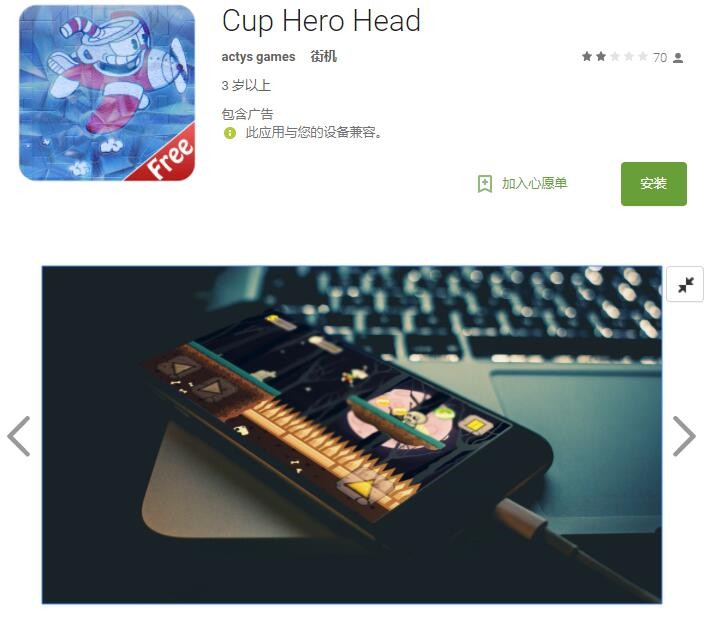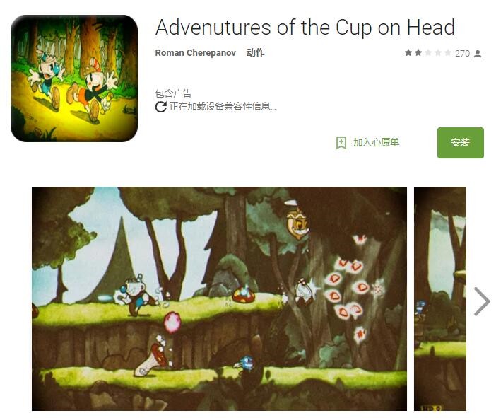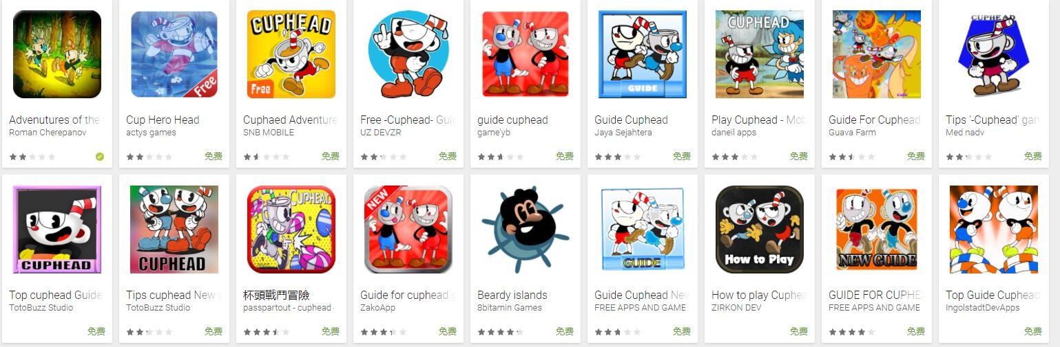 随着《茶杯头》的风靡,山寨手游也盯上了这个IP,并且开始在APP商店中涌现。虽然这款游戏没在手机平台发售,但在谷歌商店中搜索“Cuphead”即可发现,大量冒牌货充斥其中,名称、宣传图都跟原作十分相似。 这些山寨手游名字或叫做《杯在头上大冒险(Adventures of Cup on Head)》,或者《杯头战斗冒险》,游戏图标和主宣传图几乎都是直接照搬的《茶杯头》截图,也不做改动。而游戏介绍也是将《茶杯头》拿来照抄,甚至有些还是机翻。一眼看去雷同度非常高。 但实际上这些游戏玩法跟《茶杯头》几乎沾不上边,比如其中一款就有点像跑酷吃金币的游戏… 当然,这些山寨手游的评分也不会太高,很多人被套路了之后直接打了1星,不做任何评价。