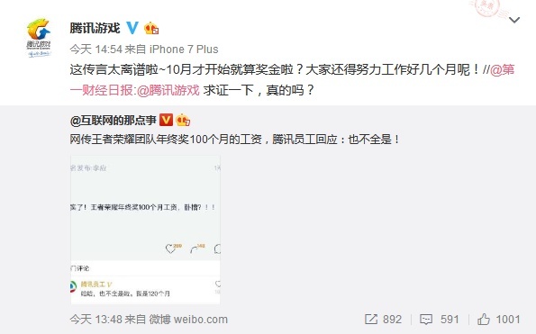 王者荣耀员工年终奖100个月工资?官博辟谣