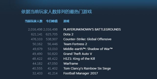 《绝地求生》的同时在线人数在190多万游荡了这么多天,终于在今晚突破了200万大关。 在Steam官方统计的数据中,目前《绝地求生》的在线人数为2016498人,而且似乎还会上涨。 第二名仍然是《Dota2》,今日峰值曾达到了625705人。第三名则是《CS:GO》,今日峰值曾达到了538907。 《绝地求生》一直保持着强劲的增长势态,游戏的销量达到了1500万。而根据此前SteamSpy的数据表明,这股助推势力来自亚洲,尤其是主要来自中国。 自从进入7月以来,《绝地求生》中国玩家(图中蓝线)的数量就在飞速蹿升;而美国玩家(图中黄线)的比例则逐步下滑,但总玩家数量仍然在上涨;而韩国玩家(图中淡红线)的比例也在持续上升,目前中国玩家已经占据了游戏总玩家数的41.62%,韩国占据了7.09%,仅中韩两国就拿下了游戏的近半壁江山。 |