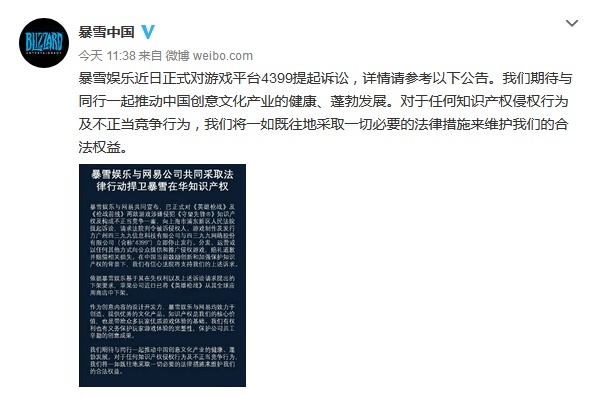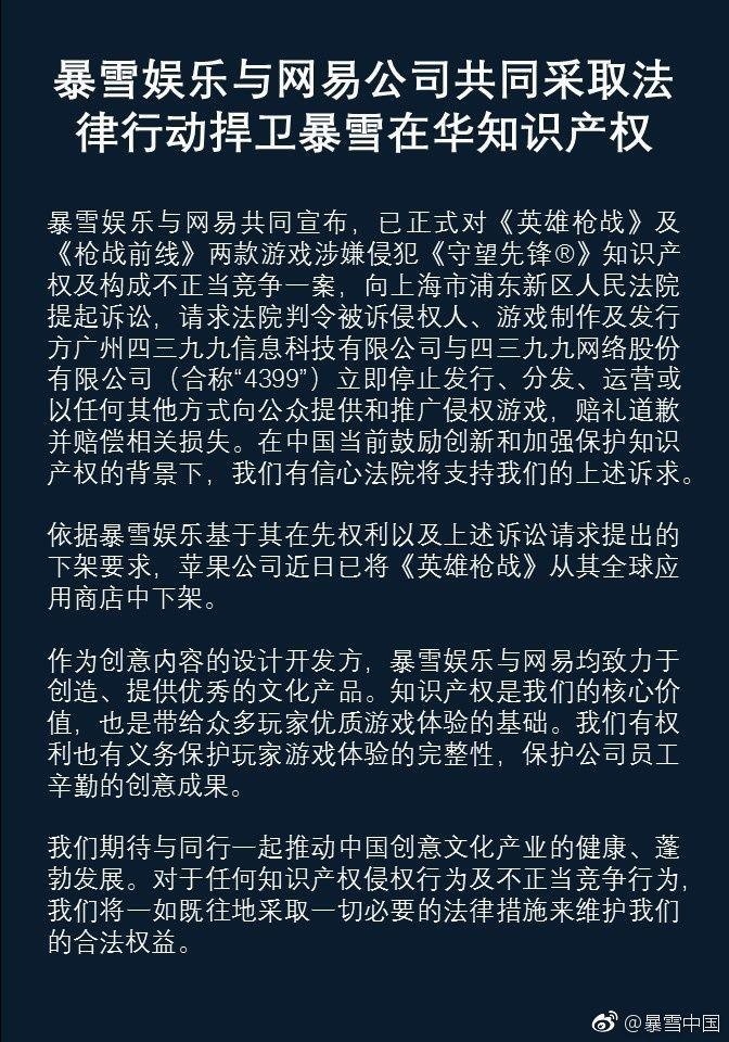今天,暴雪中国官微发表了一条新动态,称暴雪娱乐与网易已正式就《英雄枪战》及《枪战前线》两款手游涉嫌侵权《守望先锋》构成不当竞争一案,向上海市浦东新区人民法院对上述两款手游的制作及发行商4399提起诉讼。 在公告中,暴雪及网易方要求4399立即停止发行、分发、运营及任何其他方式推广侵权游戏,并要求4399方道歉并赔偿相关损失。同时公告中表示,应暴雪方面提出的下架要求,目前苹果公司已将《英雄枪战》从全球应用商店中下架。 为了方便大家理解,下面是疑似侵权《守望先锋》的两款手游部分游戏图: 看完了上面这些,各位小伙伴认为这两款手游是否有对《守望先锋》构成侵权?你又是否支持网易和暴雪方面维权的做法?欢迎说出你的看法! 了解更多相关信息,请前往http://news.yzz.cn/ku/overwatch/ |